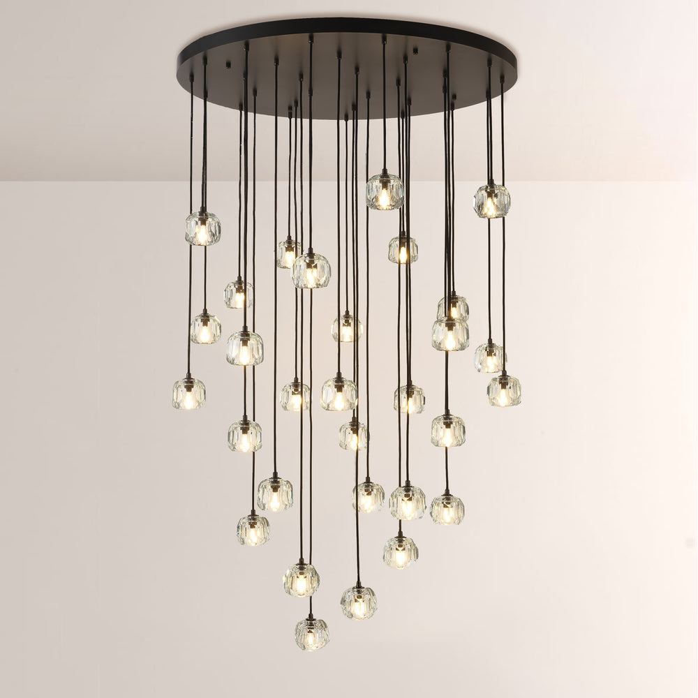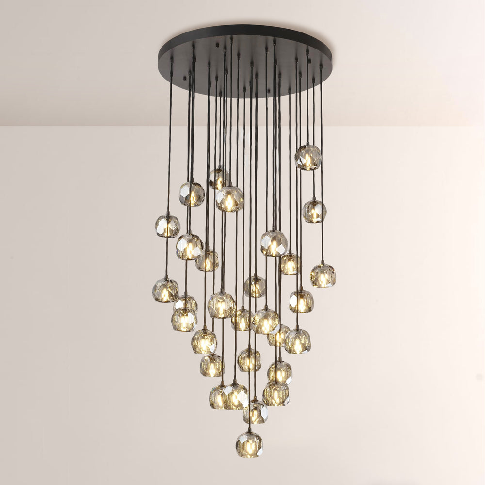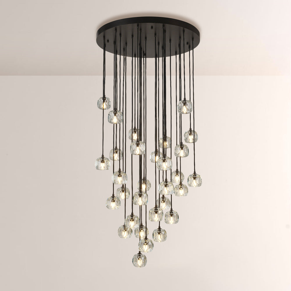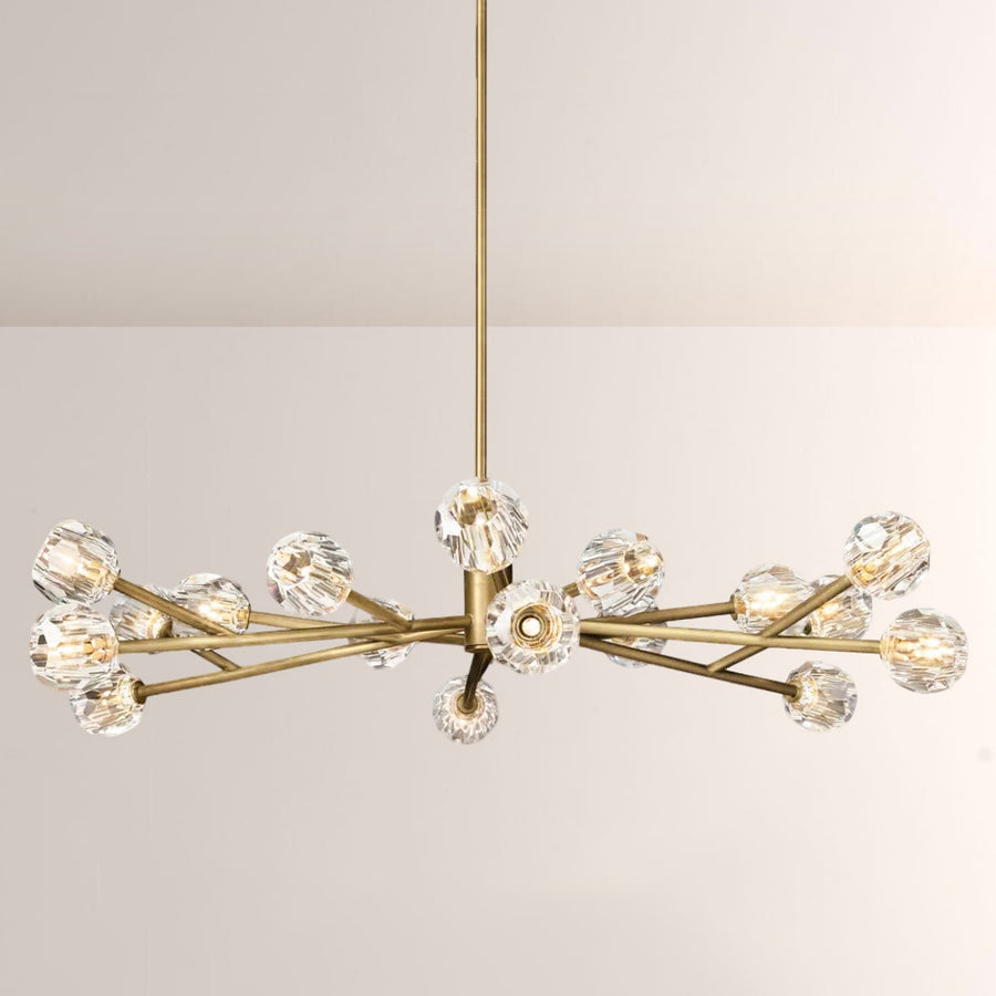 Crafted of solid brass and crystal glass, the sculptural fixture is a testament to our passion for luxe materials and superior craftsmanship. Evoking the minimalist spirit of 1960s design, each finely faceted sphere is ground and polished by hand to reflect and refract the light.