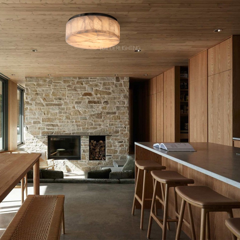 A collection of chandelier with minimal shapes and striking effects, highlighting the beauty of calcite, a translucent stone that radiates a warm, natural glow. Halos of polished stone are suspended from slender steel cables, artfully stitched together to create a smooth, continuous surface, while subtle lighting inside accentuates the organic colors and textures. Each luminaire is a unique statement.
