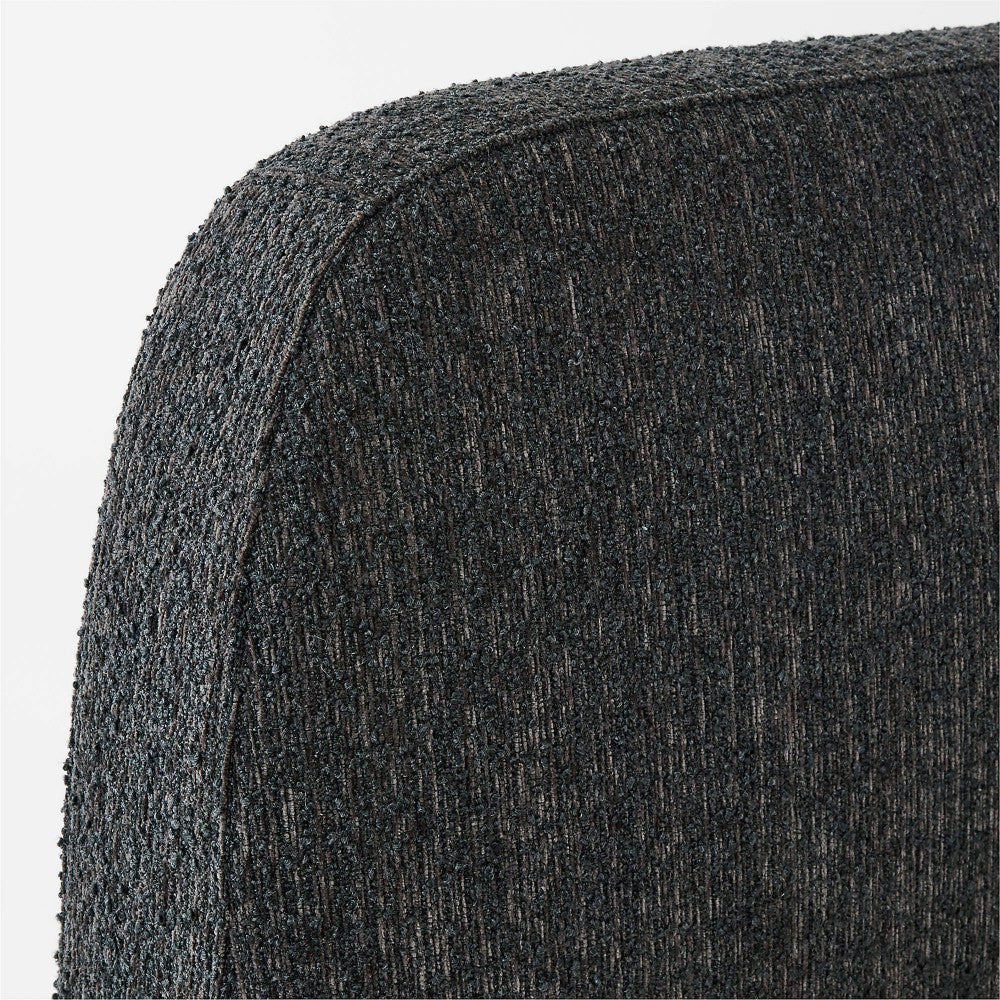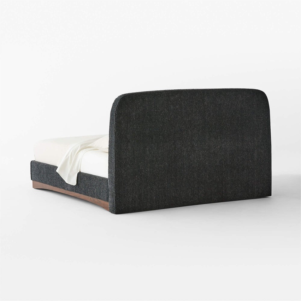 Upholstered bed updates a classic silhouette with soft, rounded corners. Tall headboard, siderails and footboard are fully upholstered in a soft, textured performance fabric that resists stains and is easy to clean. The bed sits on a wooden plinth base with a gracious arch detail on the front and sides. Made from American red oak, it's a piece designed to withstand trends and never go out of style.