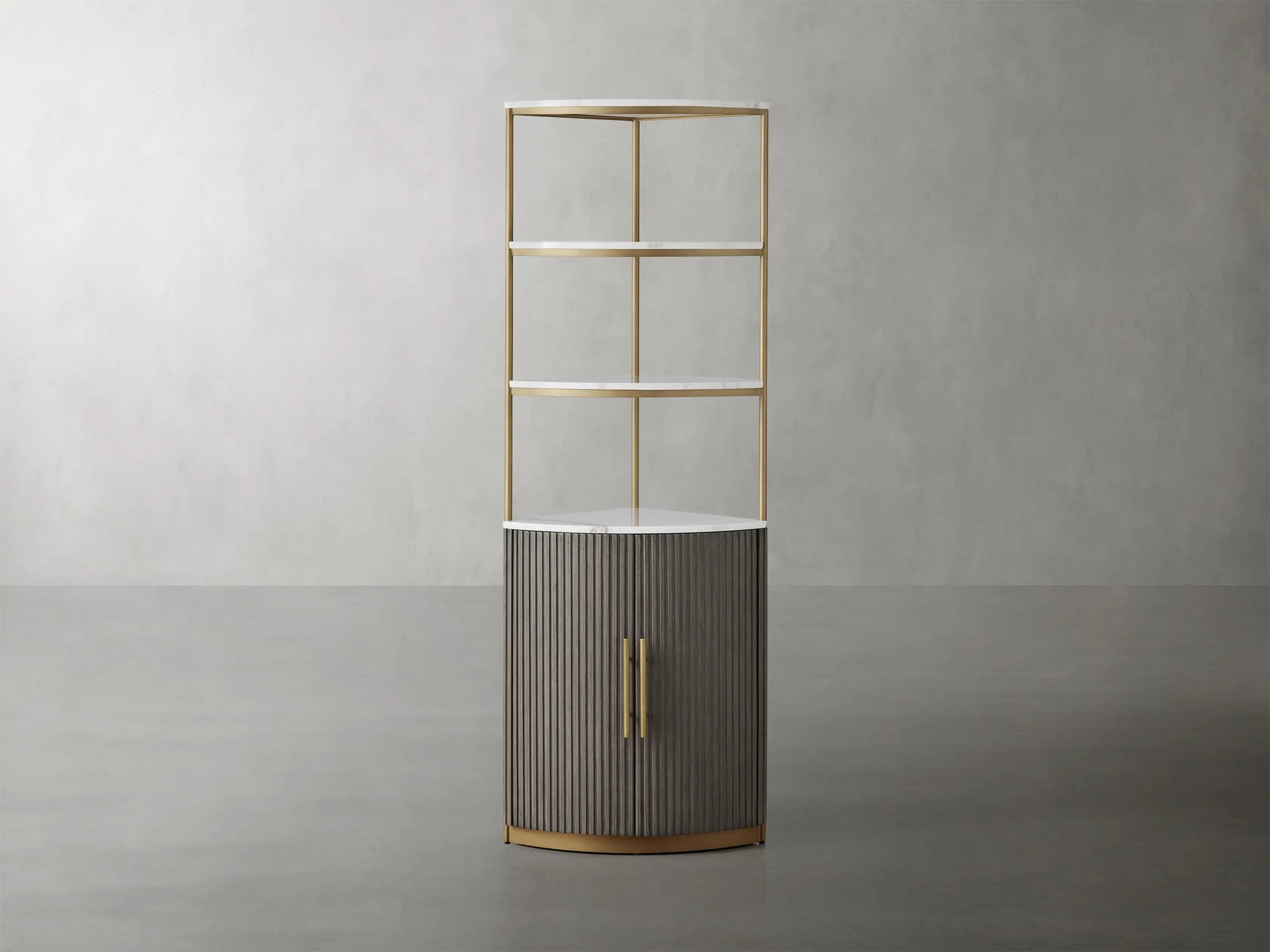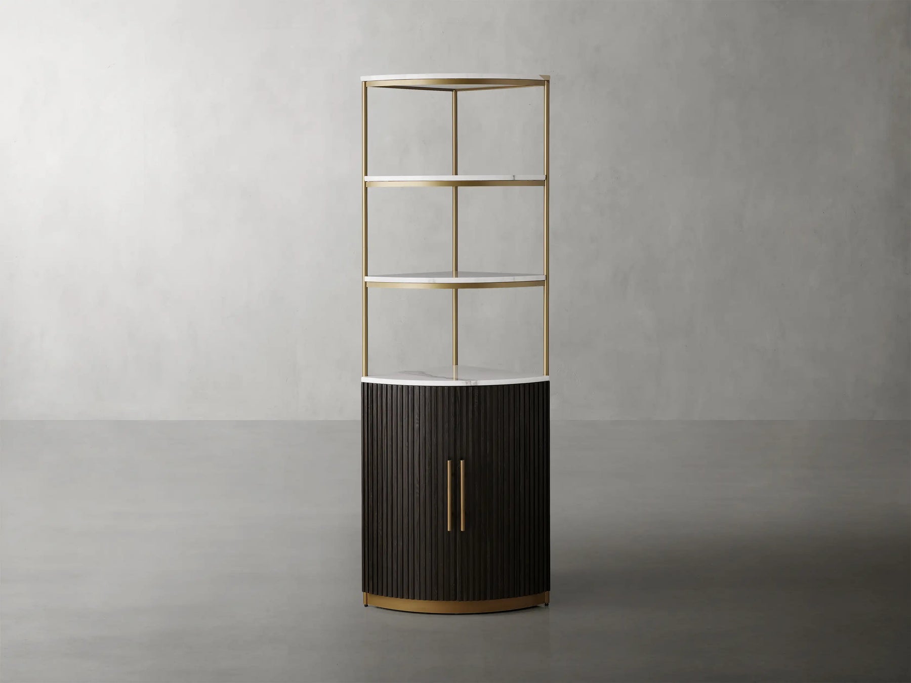 - Zinc-alloy edge pulls on each cabinet door feature a light brass finish.