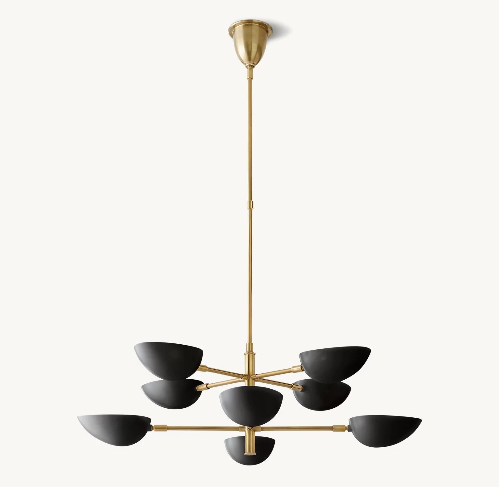 Designer Aerin Lauder of New York redefines modern grandeur with Graphic, featuring an array of eight cup shades that shine light upwards to create a beautiful reflection from the ceiling. Composed in concentric tiers, powdercoated steel arms in a hand-rubbed antique brass finish rotate from a central axis for a dramatic, sculptural effect.