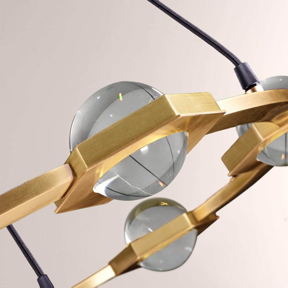 The collection features lighted crystal orbs, suspended in hexagonal fittings within a flat metal frame. The design was inspired by plans for the cenotaph of Sir Isaac Newton drawn by 18th-century architect Etienne Louis Boullée, a visionary ode to physics reinterpreted in a stunning contemporary form.