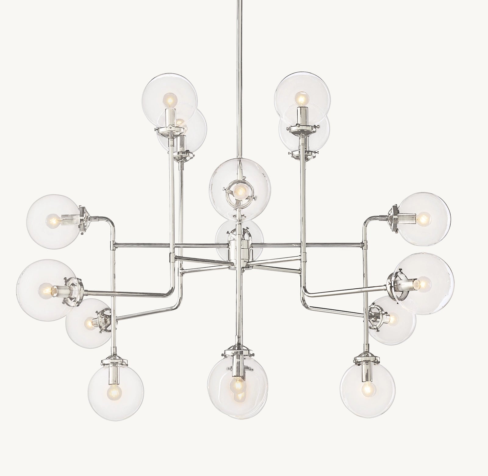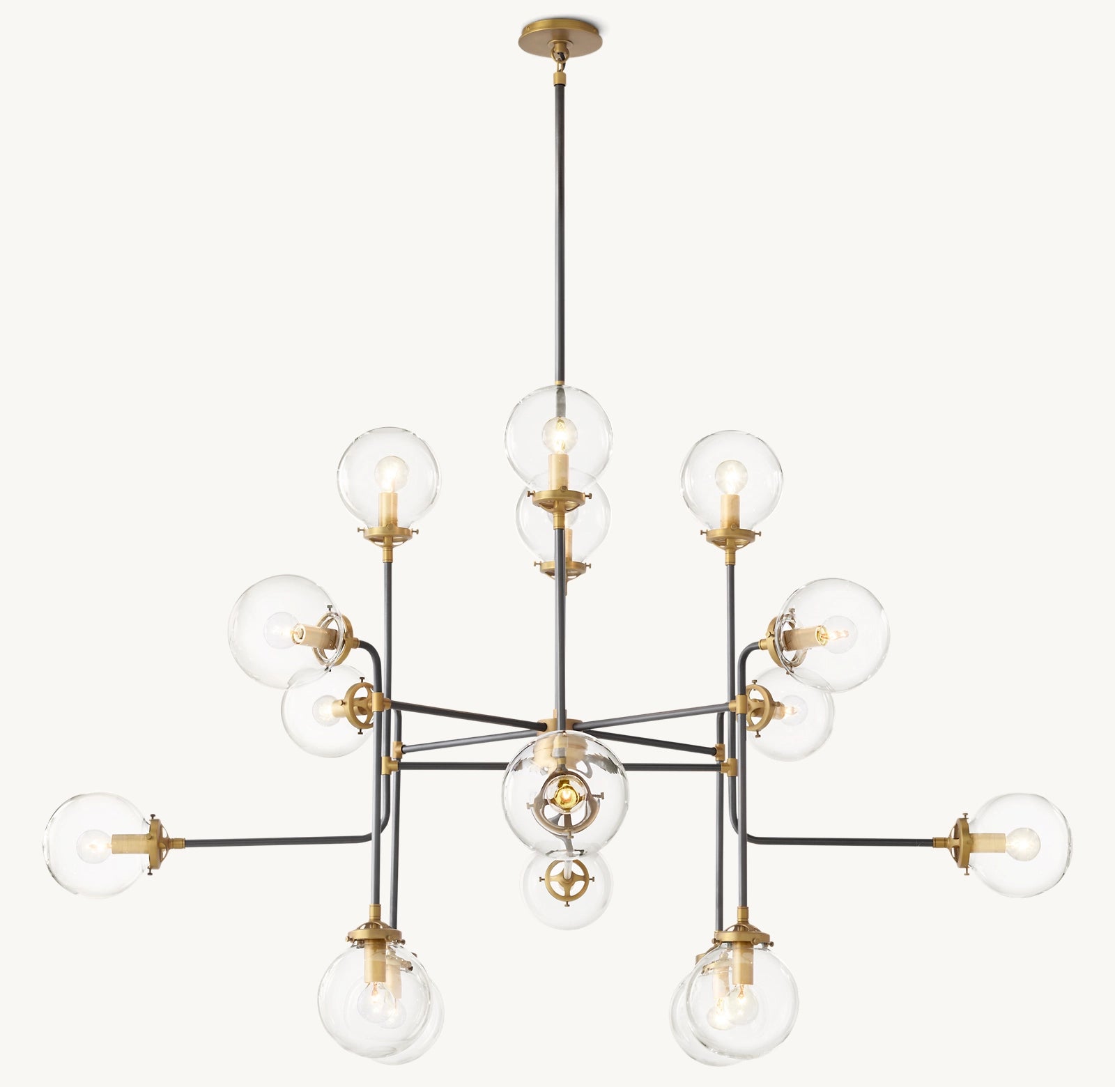 Inspired by 1940s industrialism, our globe chandelier's lines and spheres are reminiscent of an urban subway map. Eight glass shades are joined by metal tubing and carefully balanced on vertical threaded rods.