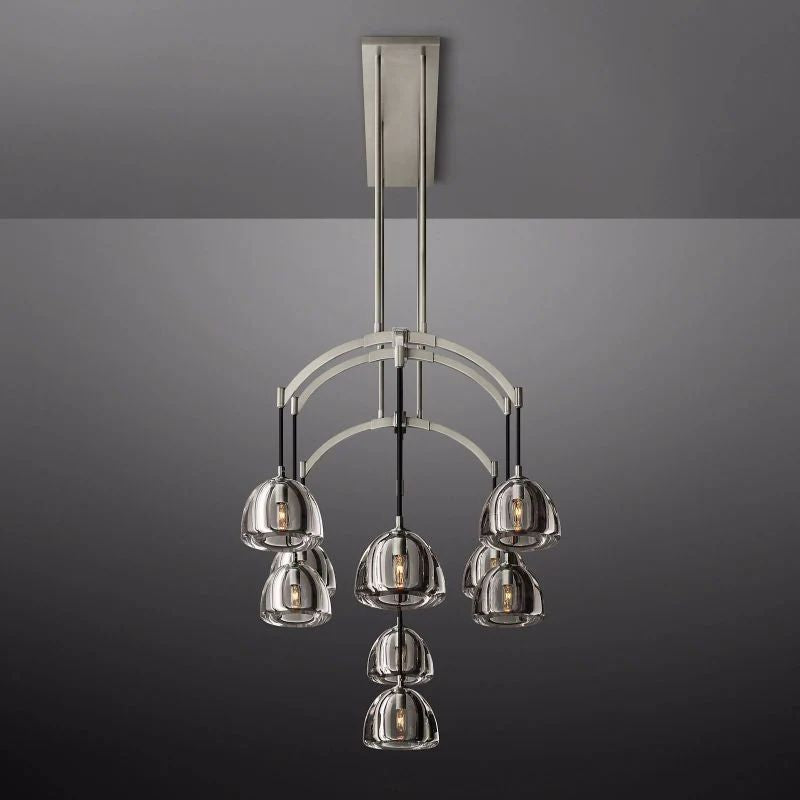 Evoking the 12th-century structure's flying buttresses, the fixture's winged armature holds aloft hemispheres of cross-cut glass. Lathe-carved from solid blocks of crystal and then hand polished, the thick, heavy domes play counterpoint to the solid brass frame's delicate arc – a vision at once fixed and fluid, strong and fragile. Viewed as an object in space, the silhouette creates a canopy of light overhead.