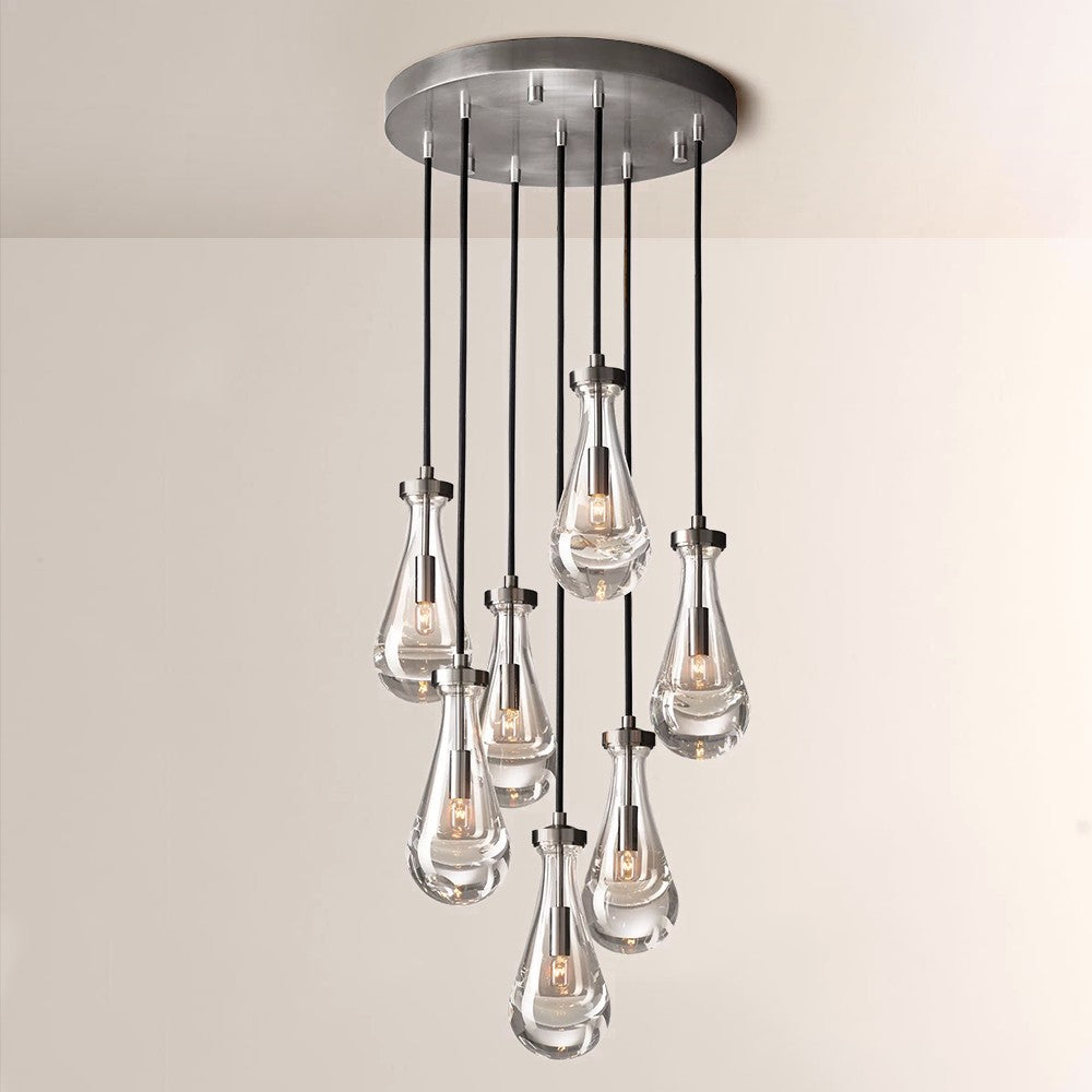 Much like the rhythm of a rainstorm itself. Suspended from slim black cords, drops of blown glass encase the bulbs – creating the illusion of underwater illumination – and cast luminous ripples that wash across ceilings and walls.