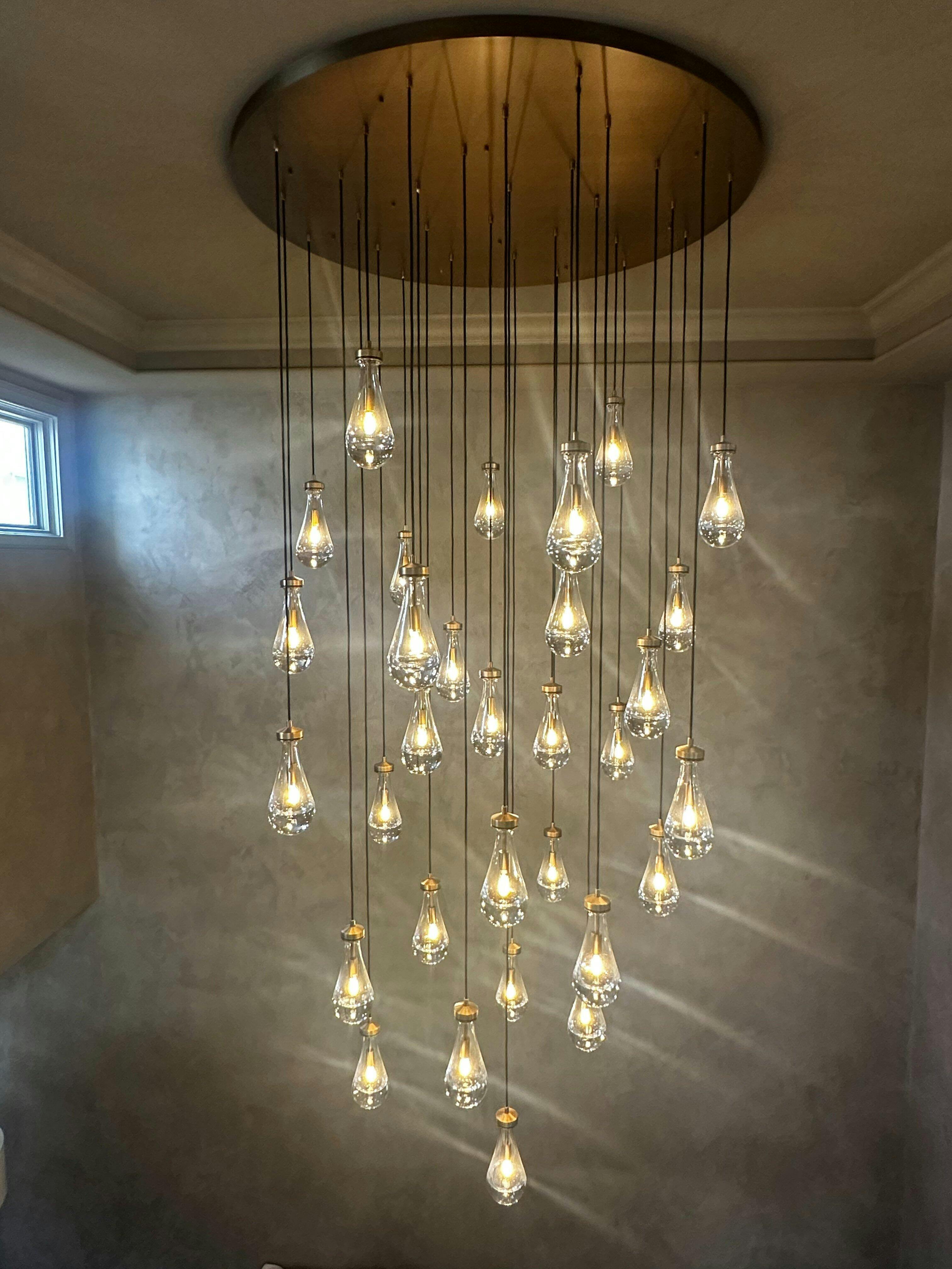 Suspended from slim black cords, drops of blown glass encase the bulbs – creating the illusion of underwater illumination – and cast luminous ripples that wash across ceilings and walls.