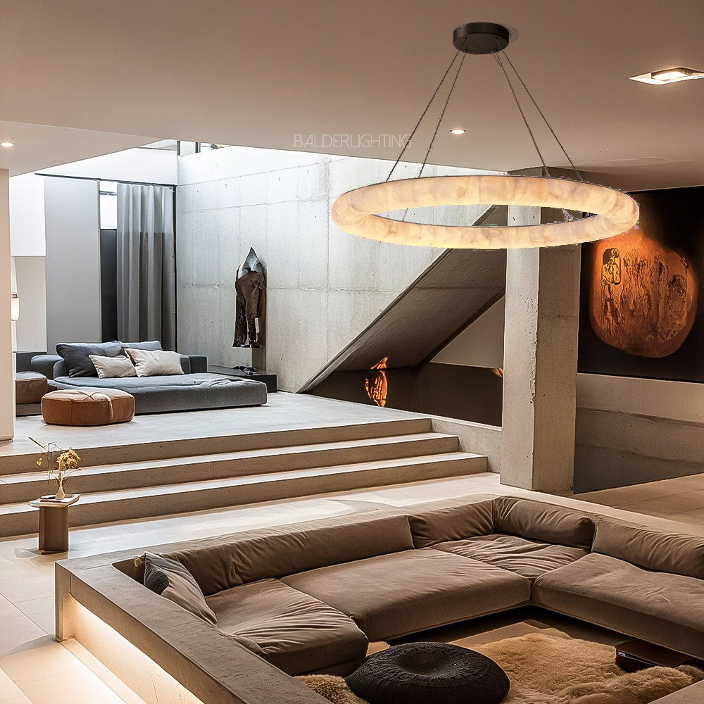 Our Rivage Lisse chandelier is minimalist in form and striking in effect, highlighting the beauty of calcite, a translucent stone that emits a warm, natural light. Suspended from slender steel cables, the chandelier’s halo of polished stone is skillfully pieced together to create a smooth, continuous surface, while subtle internal illumination highlights organic colors and textures. Each fixture is a unique statement.