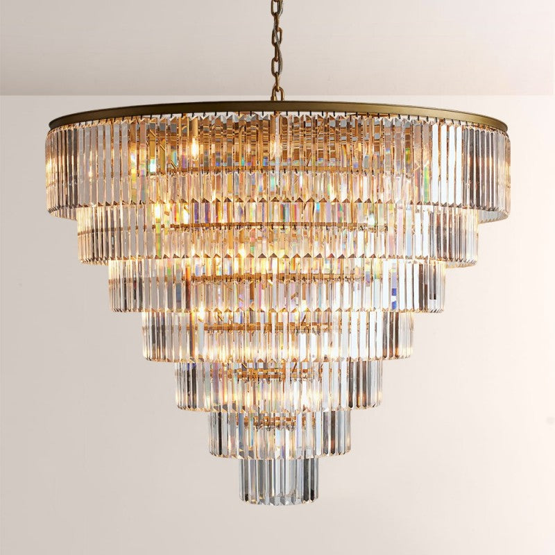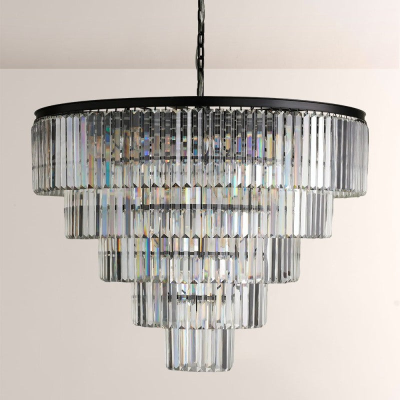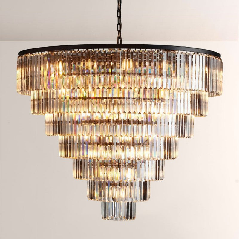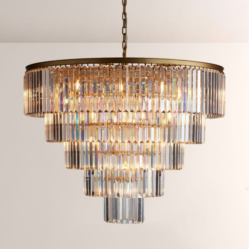 French Art Deco style of the 1920s is reborn in our glamorous Leyland Lighting Collection. Hung from a rustic iron frame, Leyland creates an atmospheric glow with its layered rows of hand-polished multifaceted glass crystals.