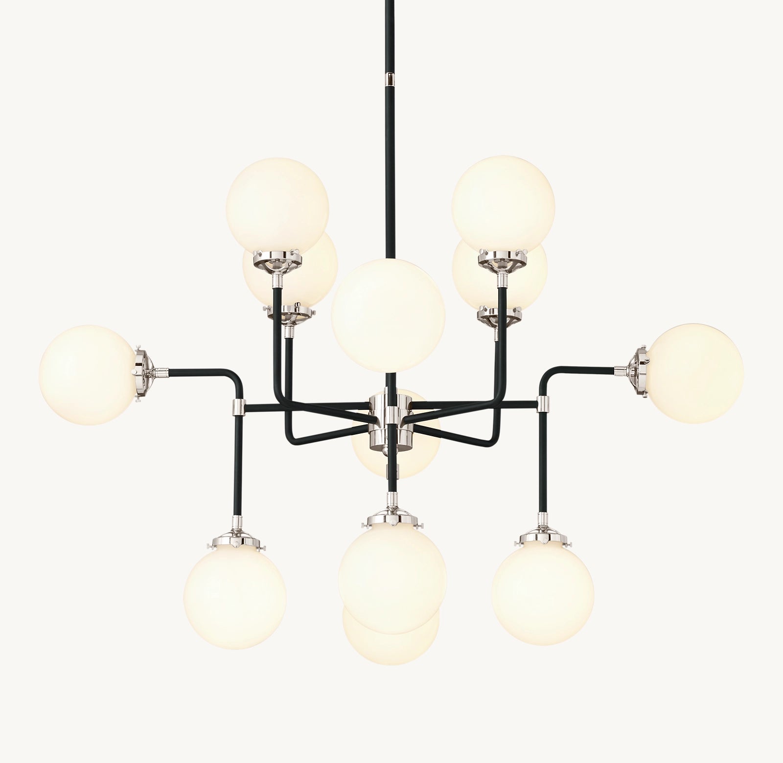 Inspired by 1940s industrialism, our globe chandelier's lines and spheres are reminiscent of an urban subway map. Eight glass shades are joined by metal tubing and carefully balanced on vertical threaded rods.