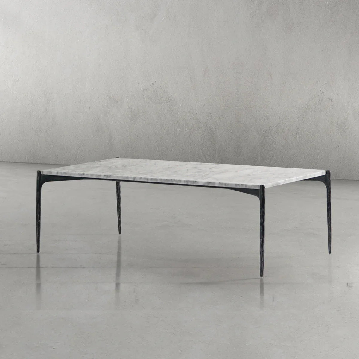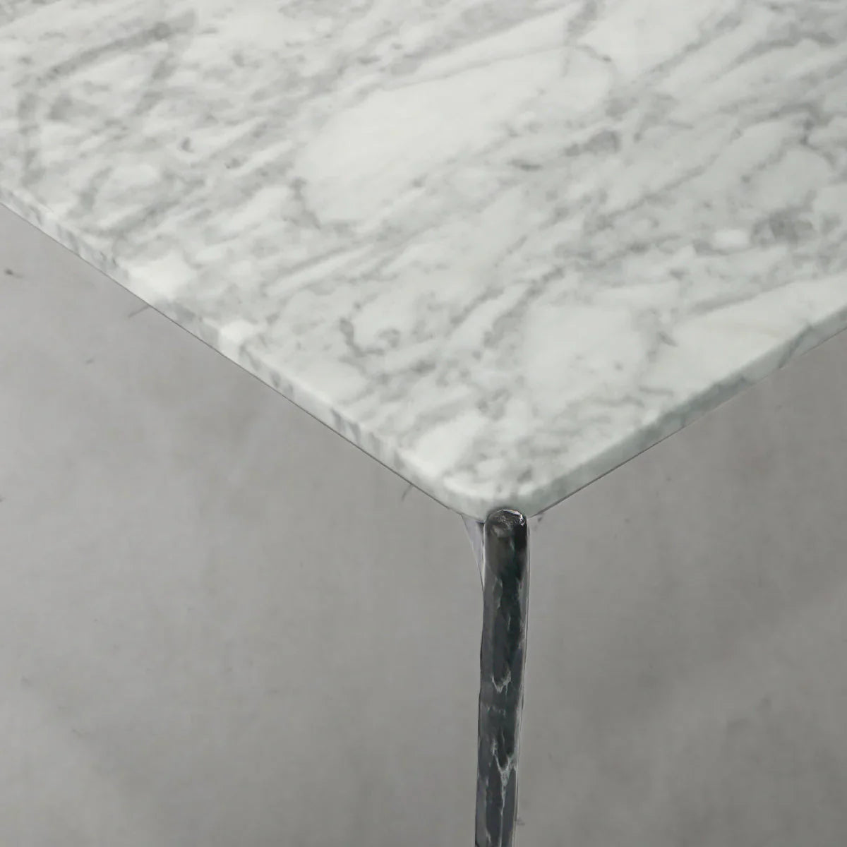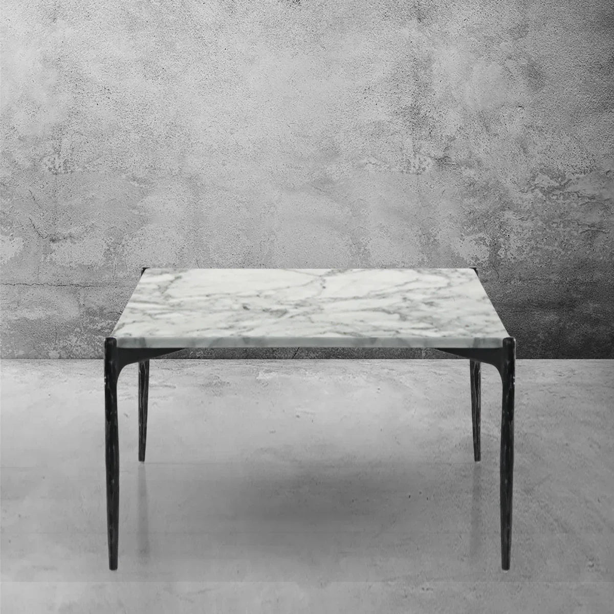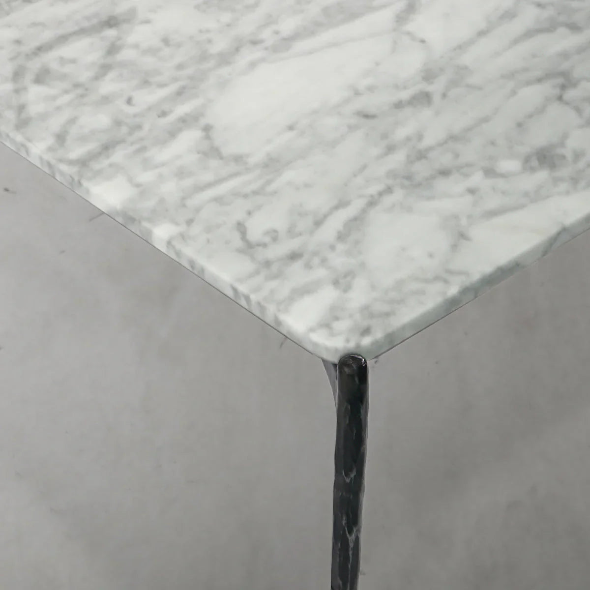 Our hand forged metal with marble collection. Using an age-old production process, artisans hand-hammer metal strips to reveal vibrant, imperfect, organic textures. The hammered, tapered silhouette provides a rich contrast to the smooth, honed stone.- Tabletop crafted of 1"-thick marble over a wood core