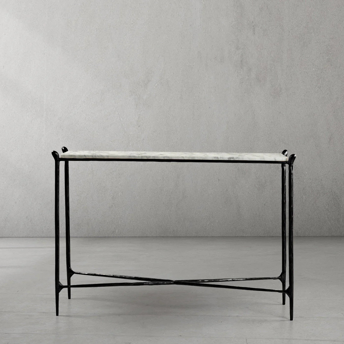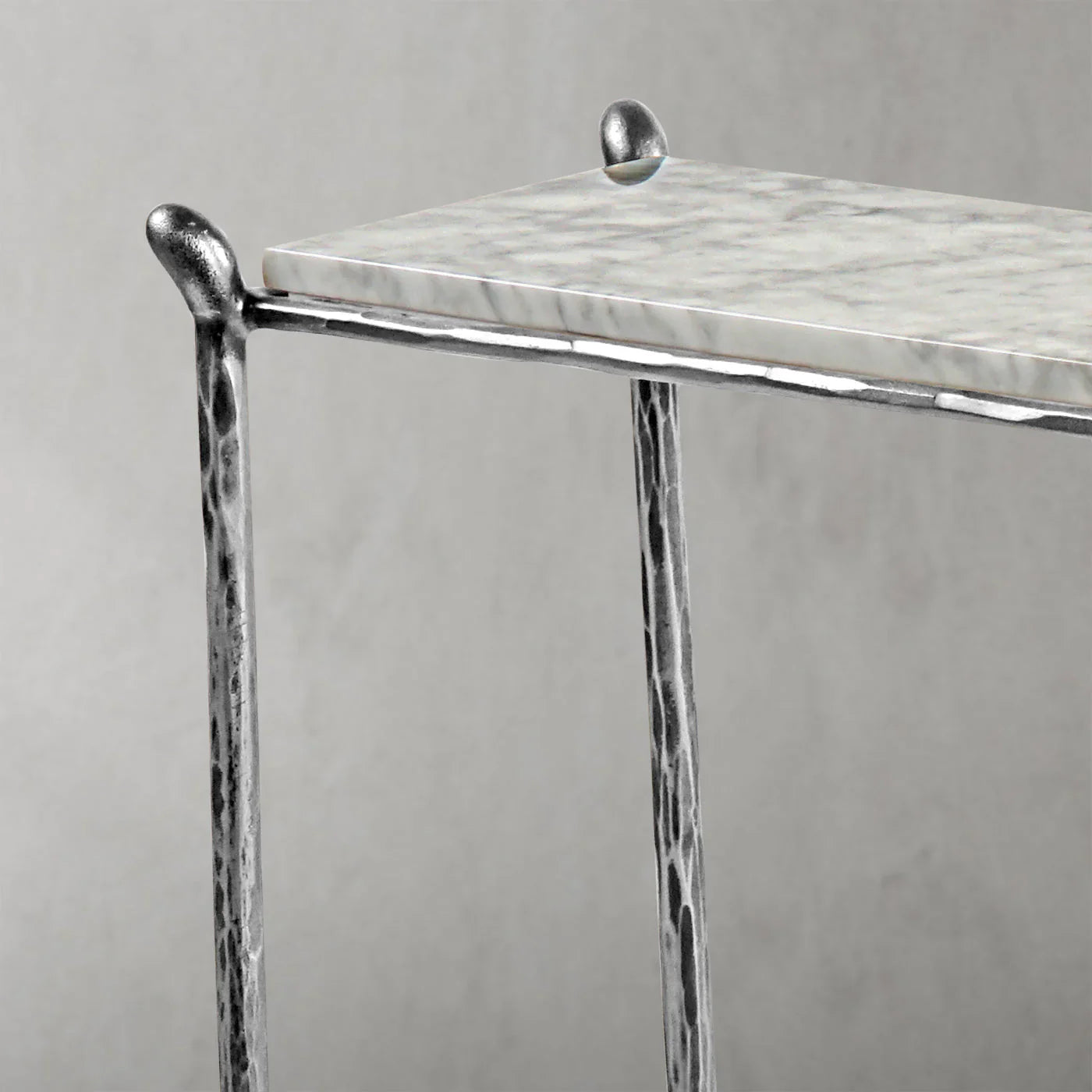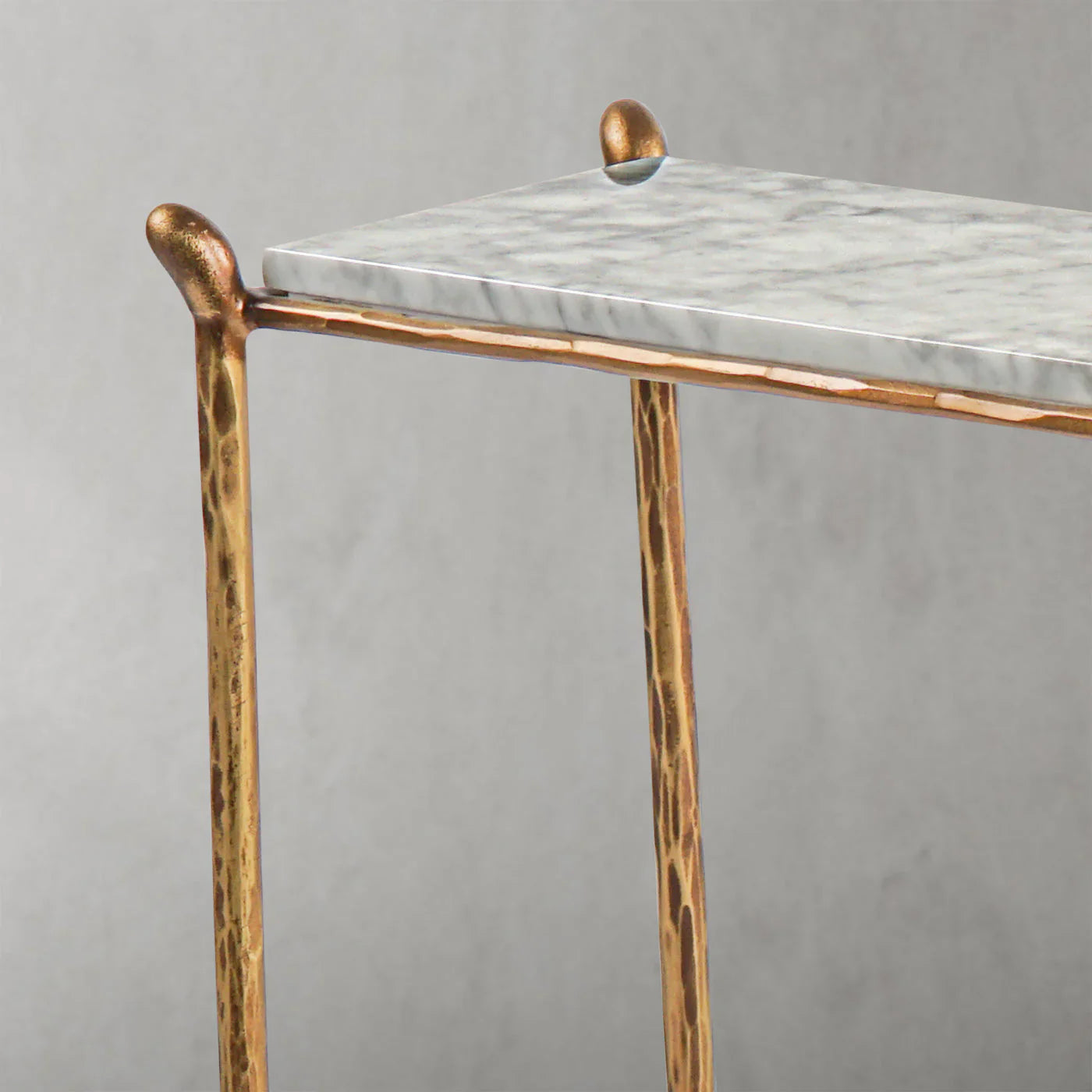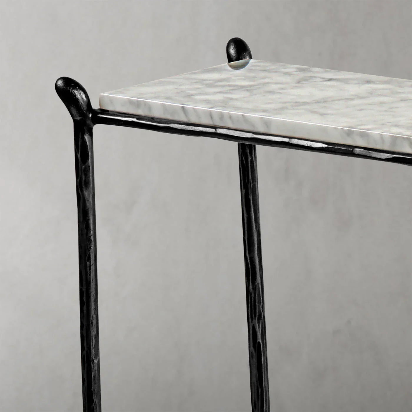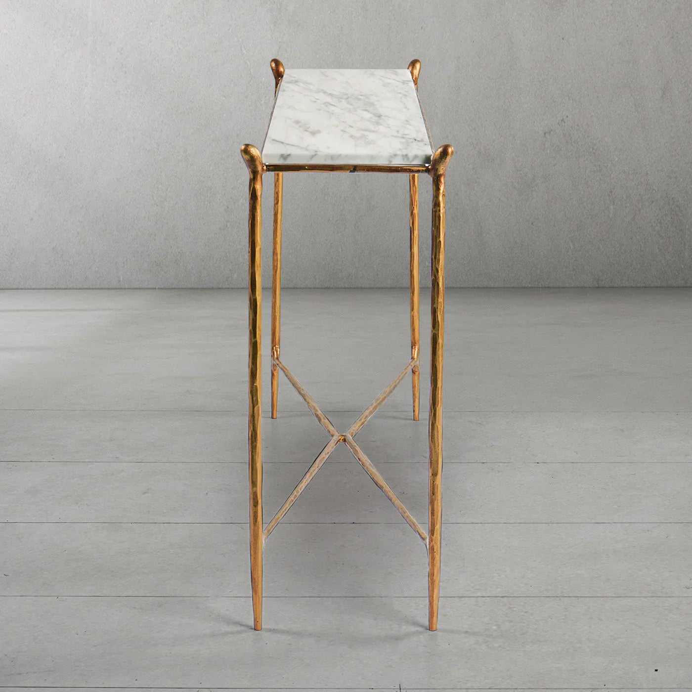 Our hand forged metal with marble collection. Using an age-old production process, artisans hand-hammer metal strips to reveal vibrant, imperfect, organic textures. The hammered, tapered silhouette provides a rich contrast to the smooth, honed stone.