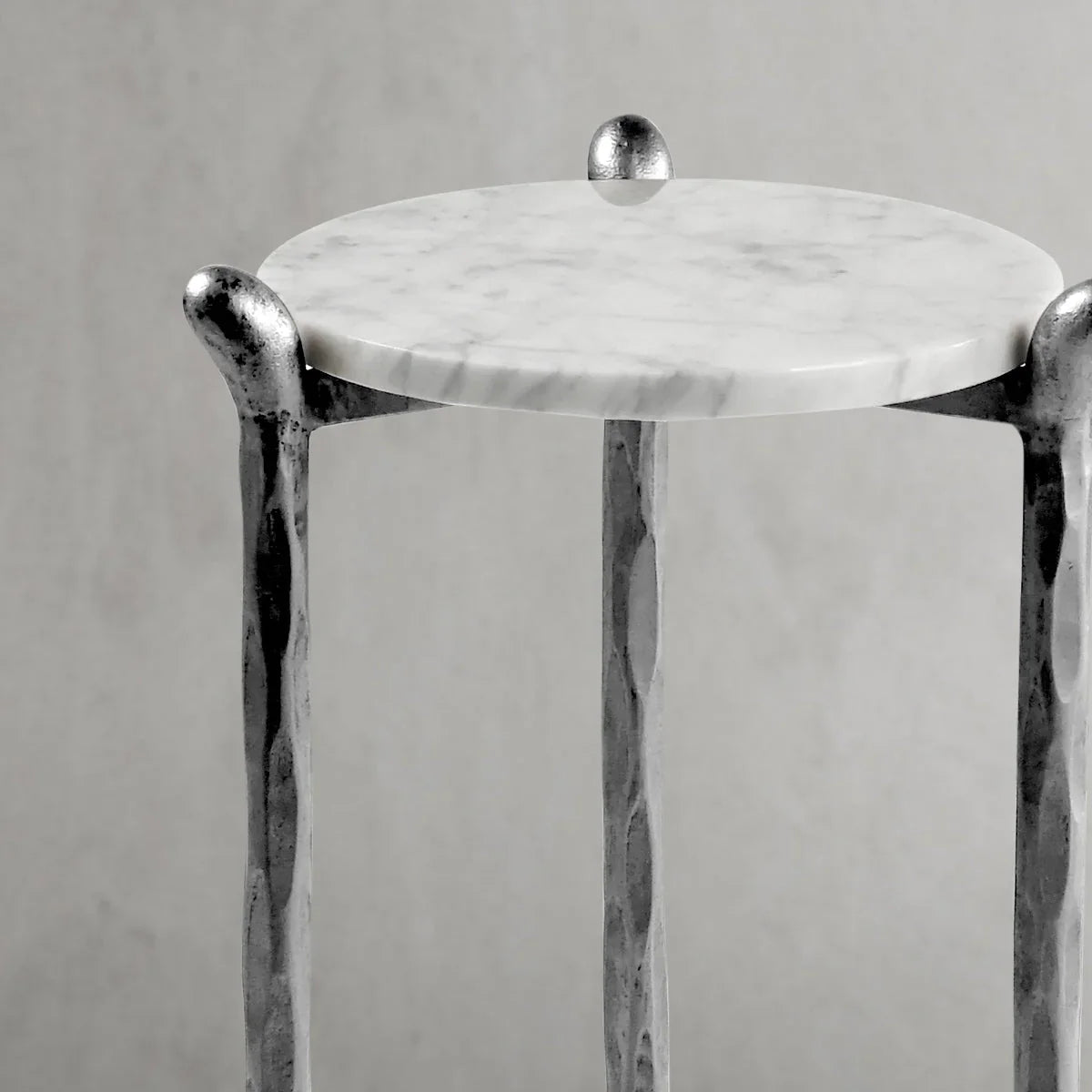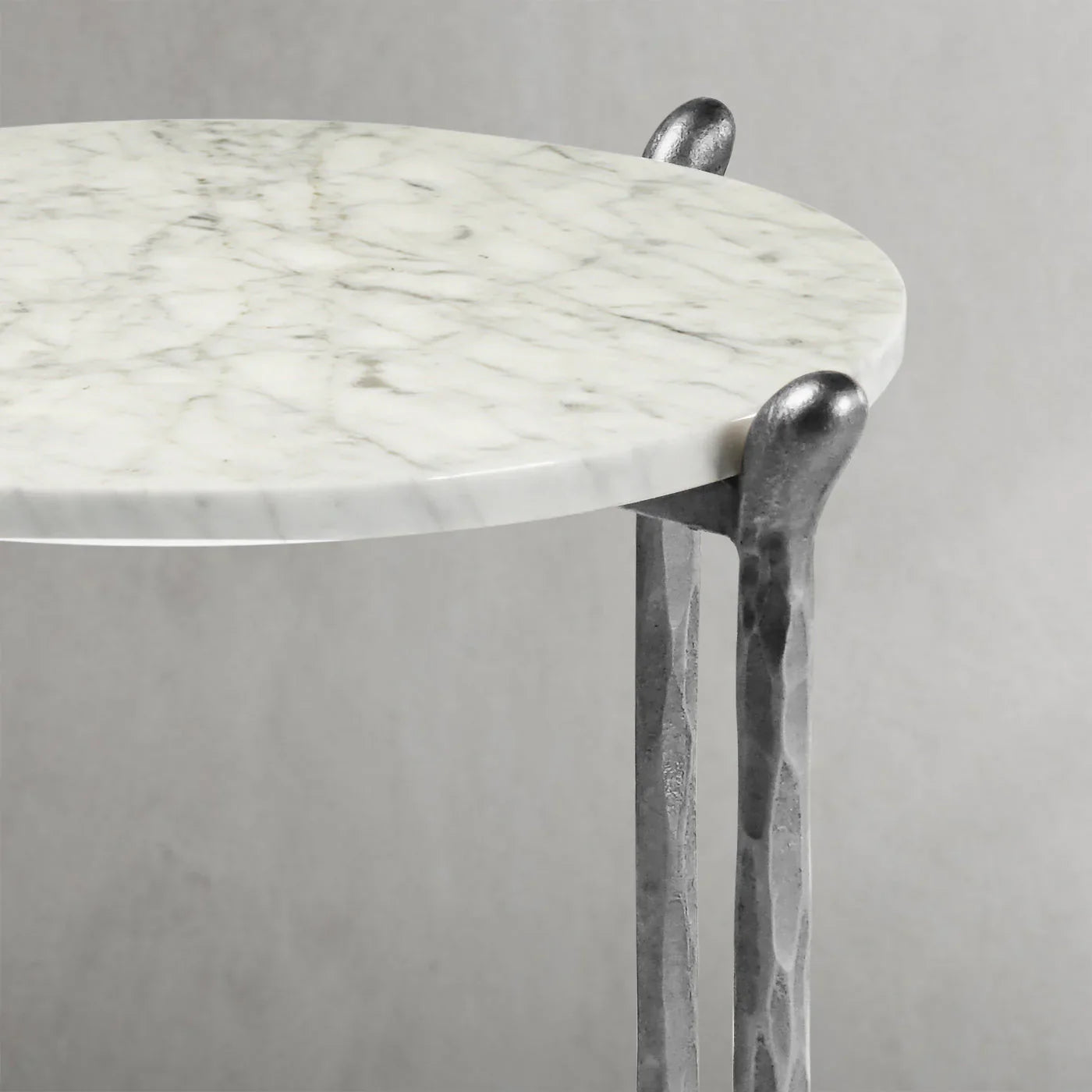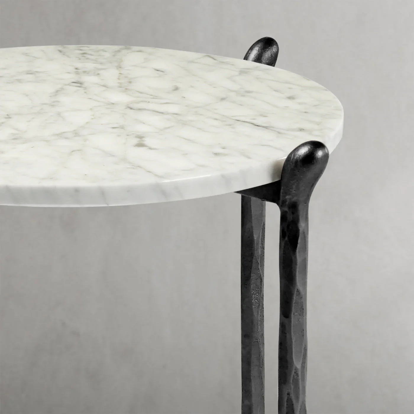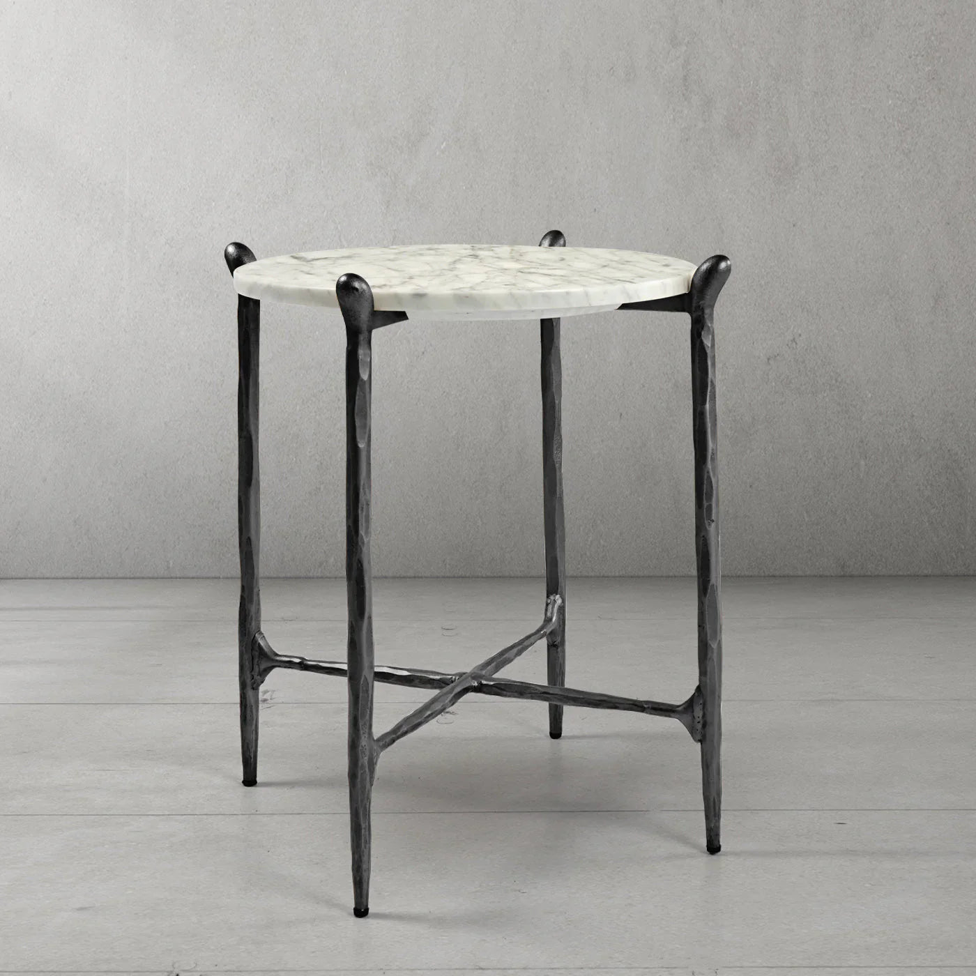 Our hand forged metal with marble collection. Using an age-old production process, artisans hand-hammer metal strips to reveal vibrant, imperfect, organic textures. The hammered, tapered silhouette provides a rich contrast to the smooth, honed stone.- Tabletop crafted of 1"-thick marble over a wood core