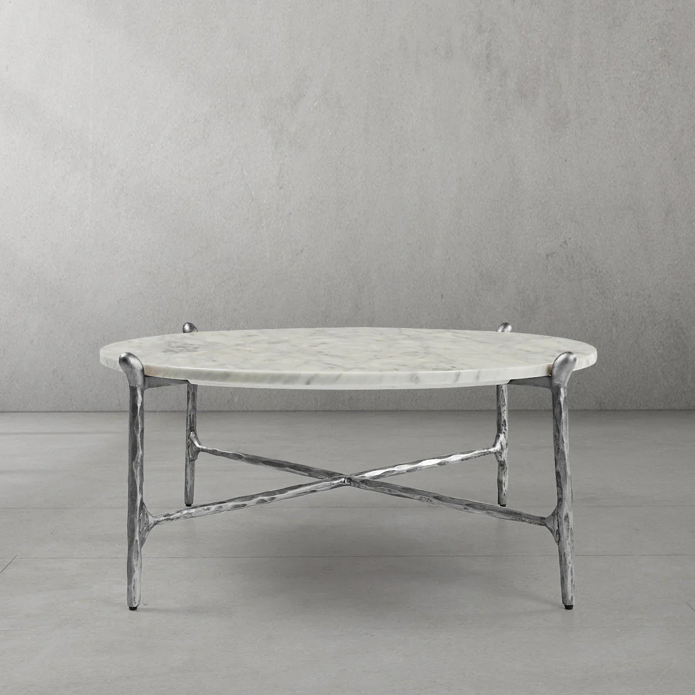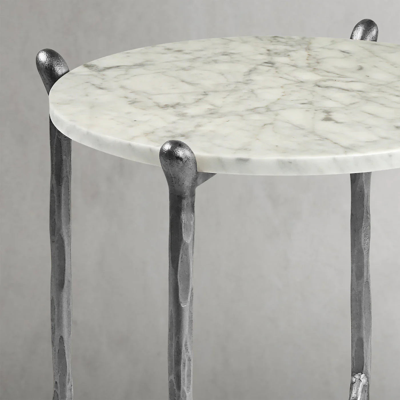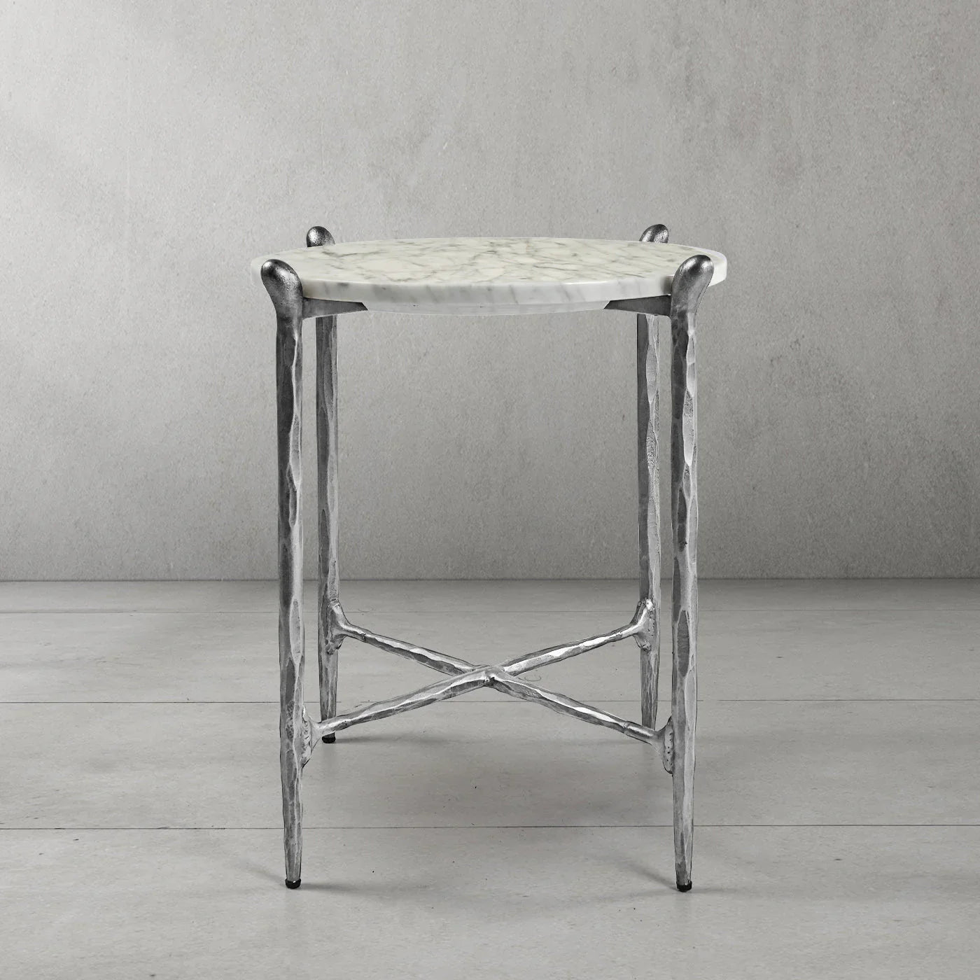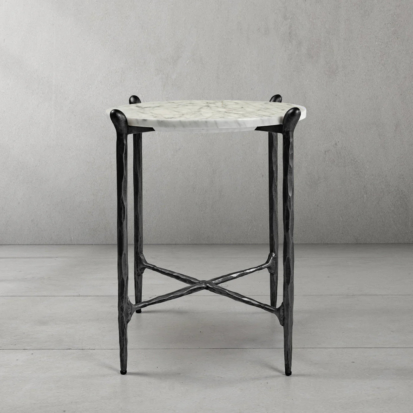 Our hand forged metal with marble collection. Using an age-old production process, artisans hand-hammer metal strips to reveal vibrant, imperfect, organic textures. The hammered, tapered silhouette provides a rich contrast to the smooth, honed stone.- Tabletop crafted of 1"-thick marble over a wood core