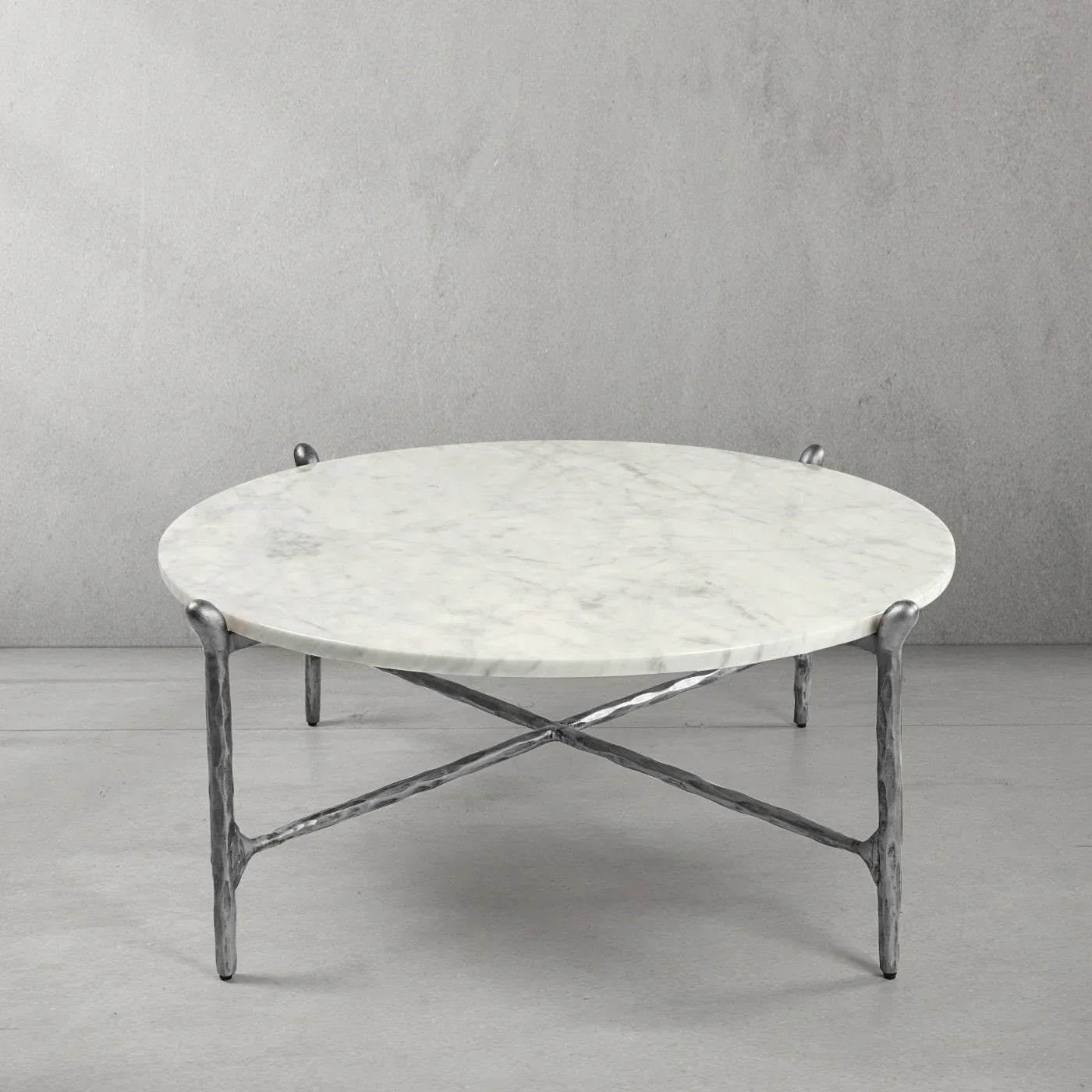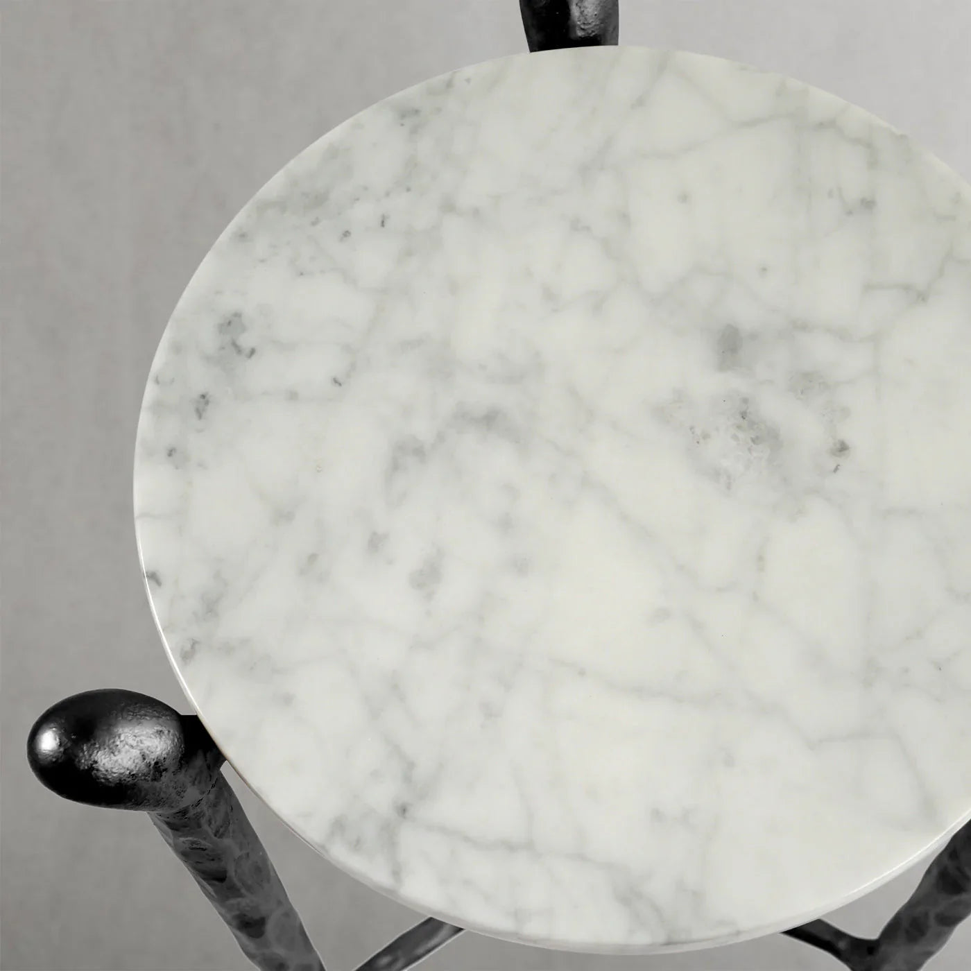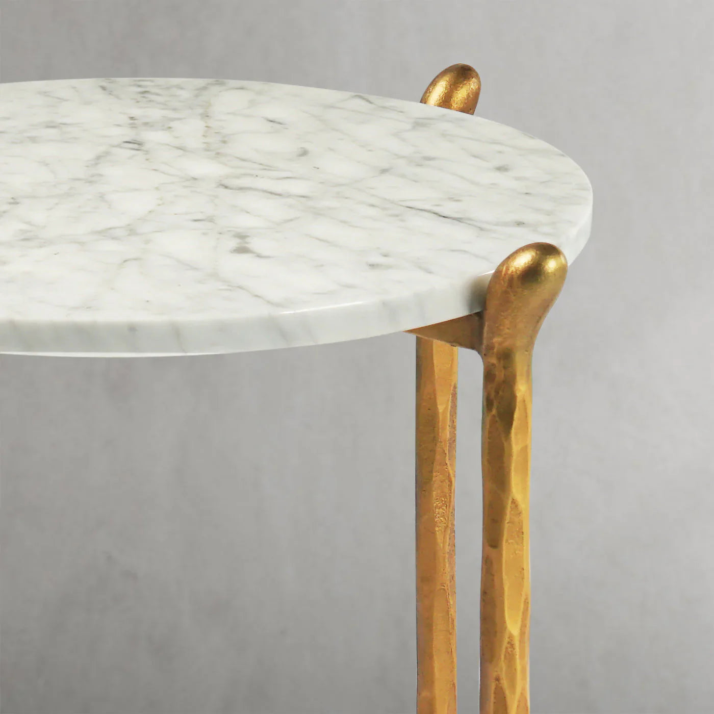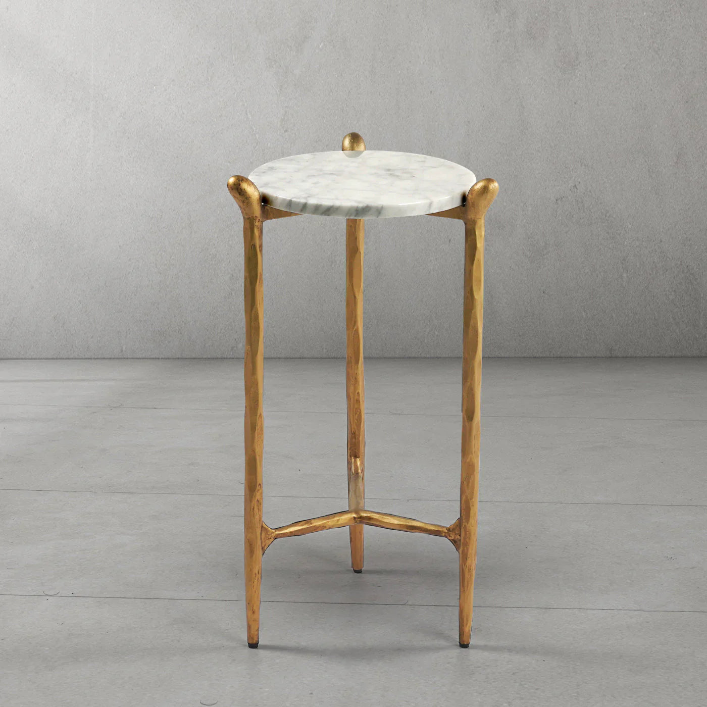 Our hand forged metal with marble collection. Using an age-old production process, artisans hand-hammer metal strips to reveal vibrant, imperfect, organic textures. The hammered, tapered silhouette provides a rich contrast to the smooth, honed stone.- Tabletop crafted of 1"-thick marble over a wood core