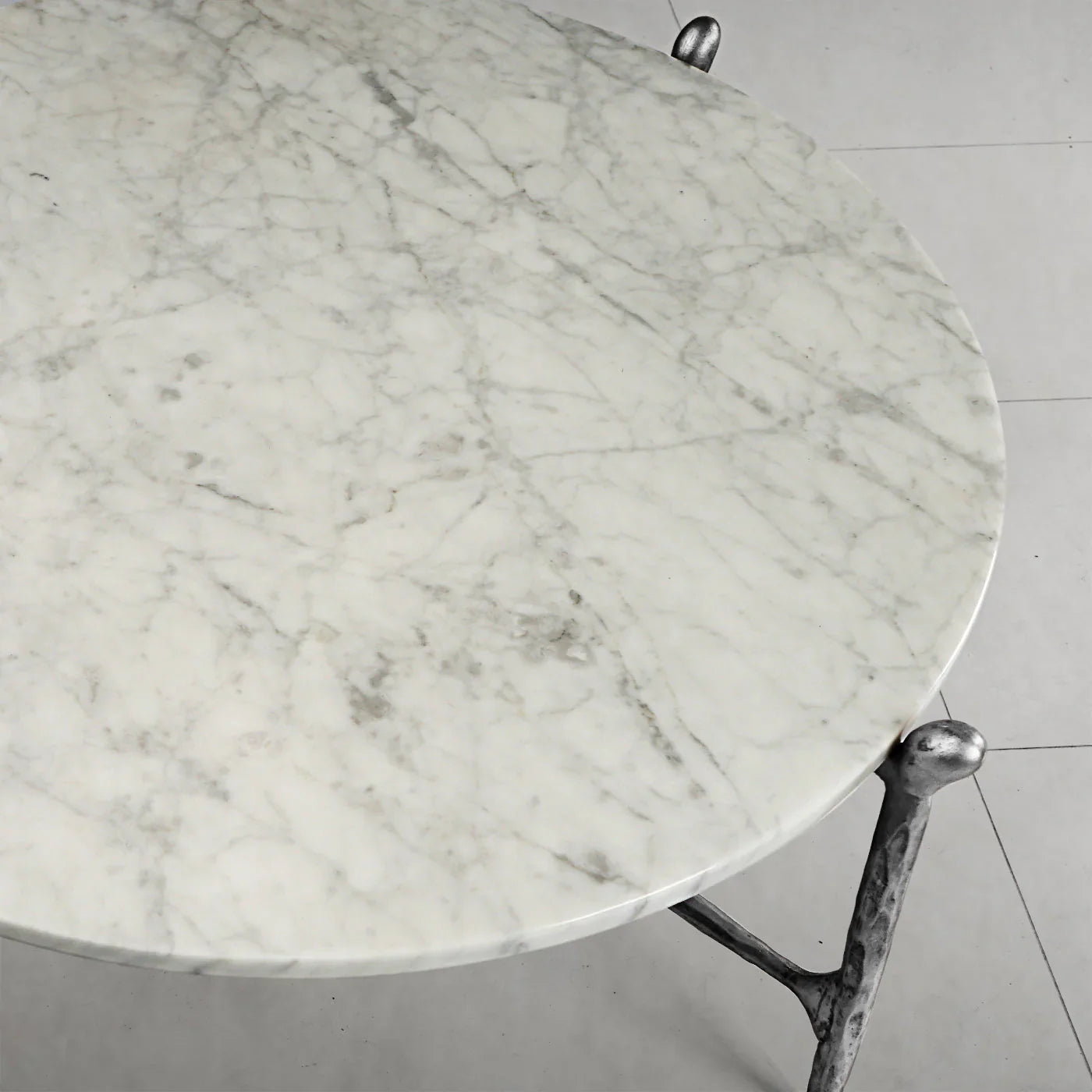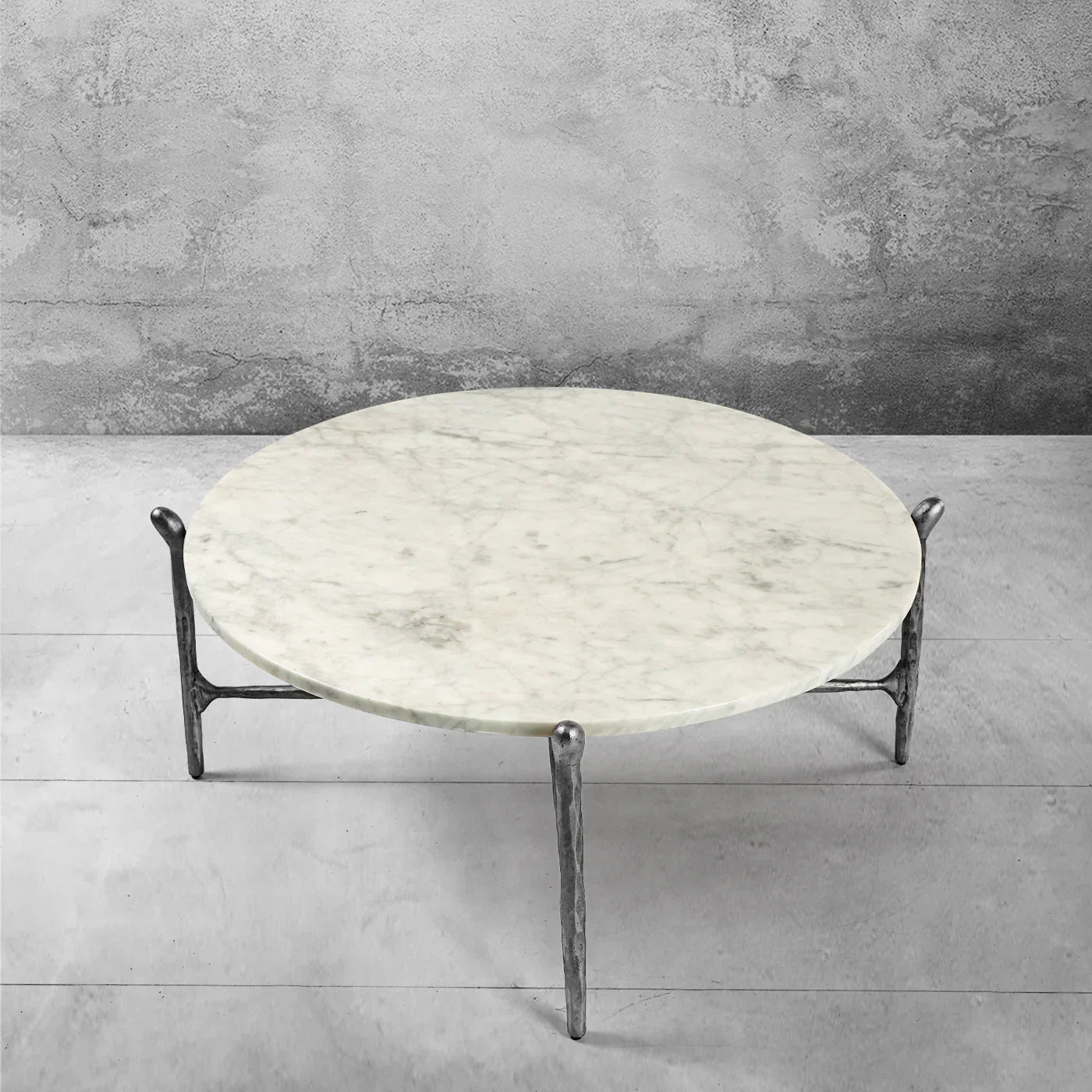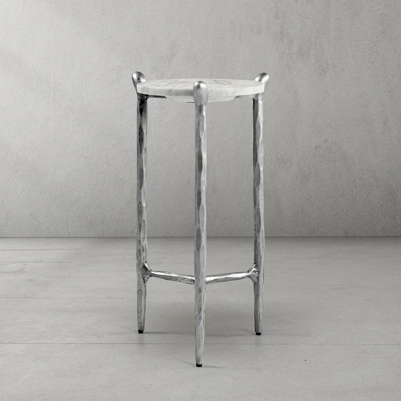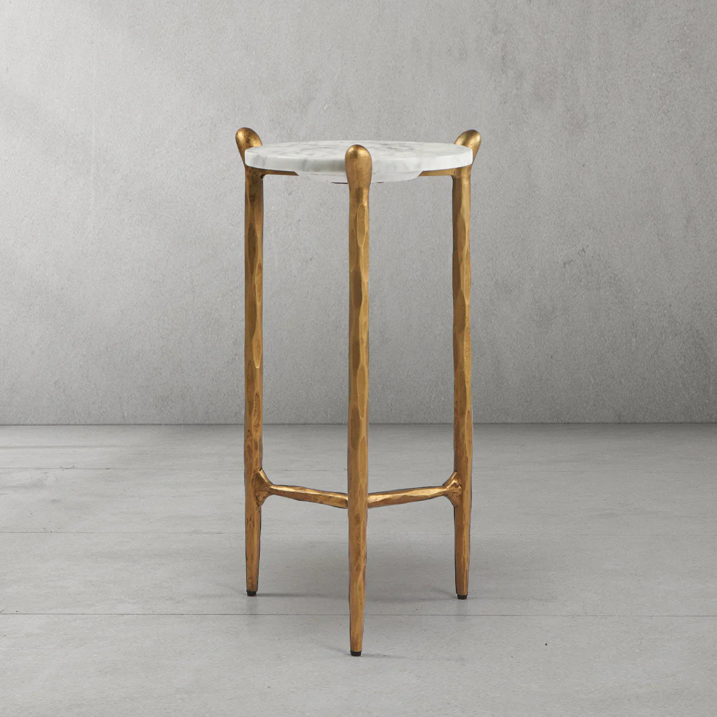 Our hand forged metal with marble collection. Using an age-old production process, artisans hand-hammer metal strips to reveal vibrant, imperfect, organic textures. The hammered, tapered silhouette provides a rich contrast to the smooth, honed stone.- Tabletop crafted of 1"-thick marble over a wood core
