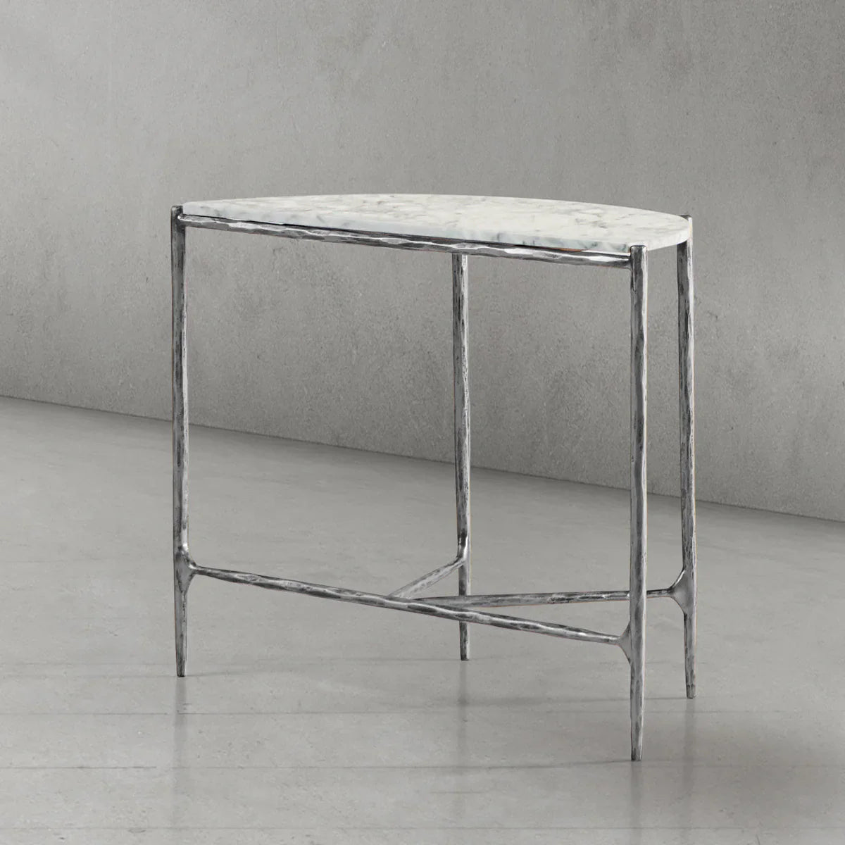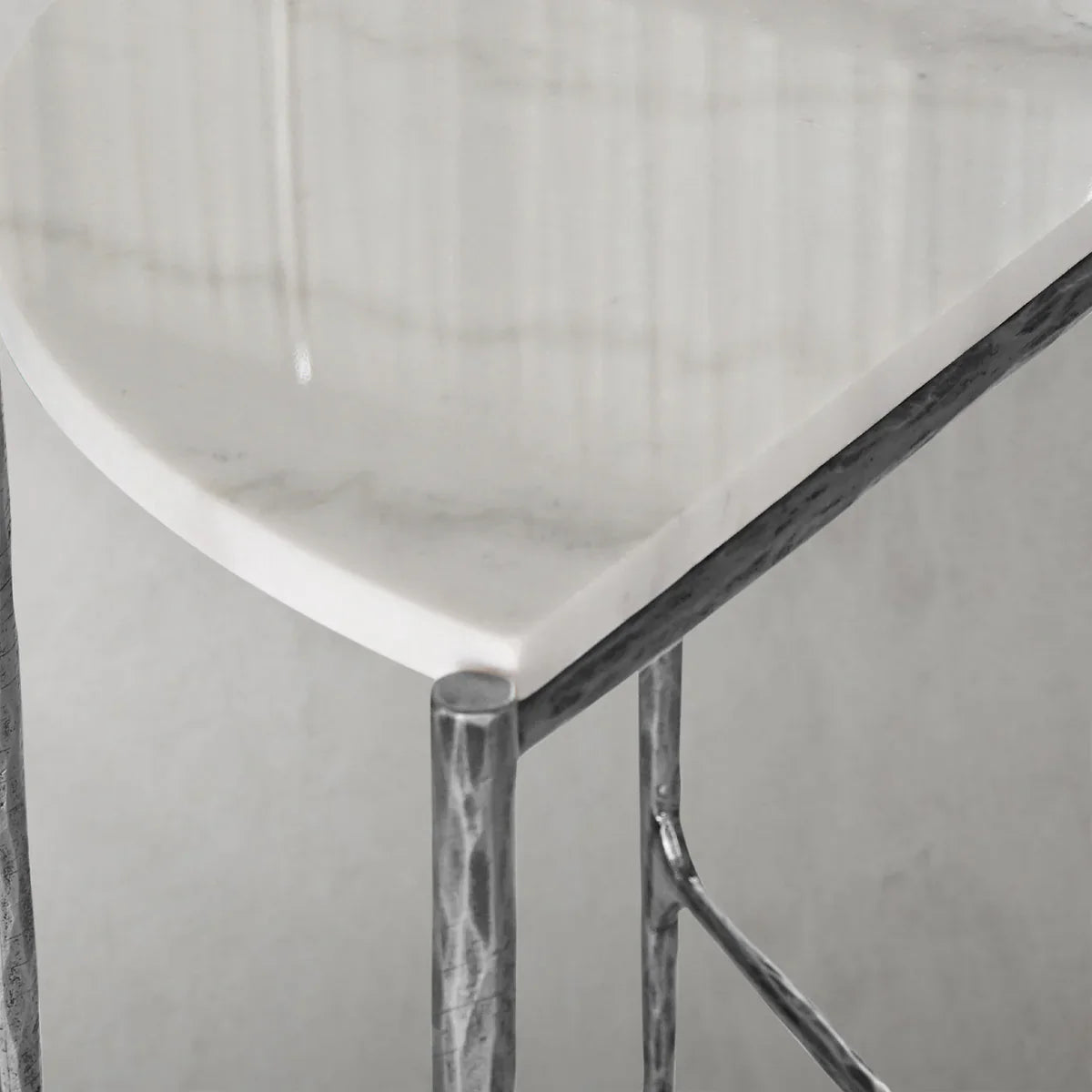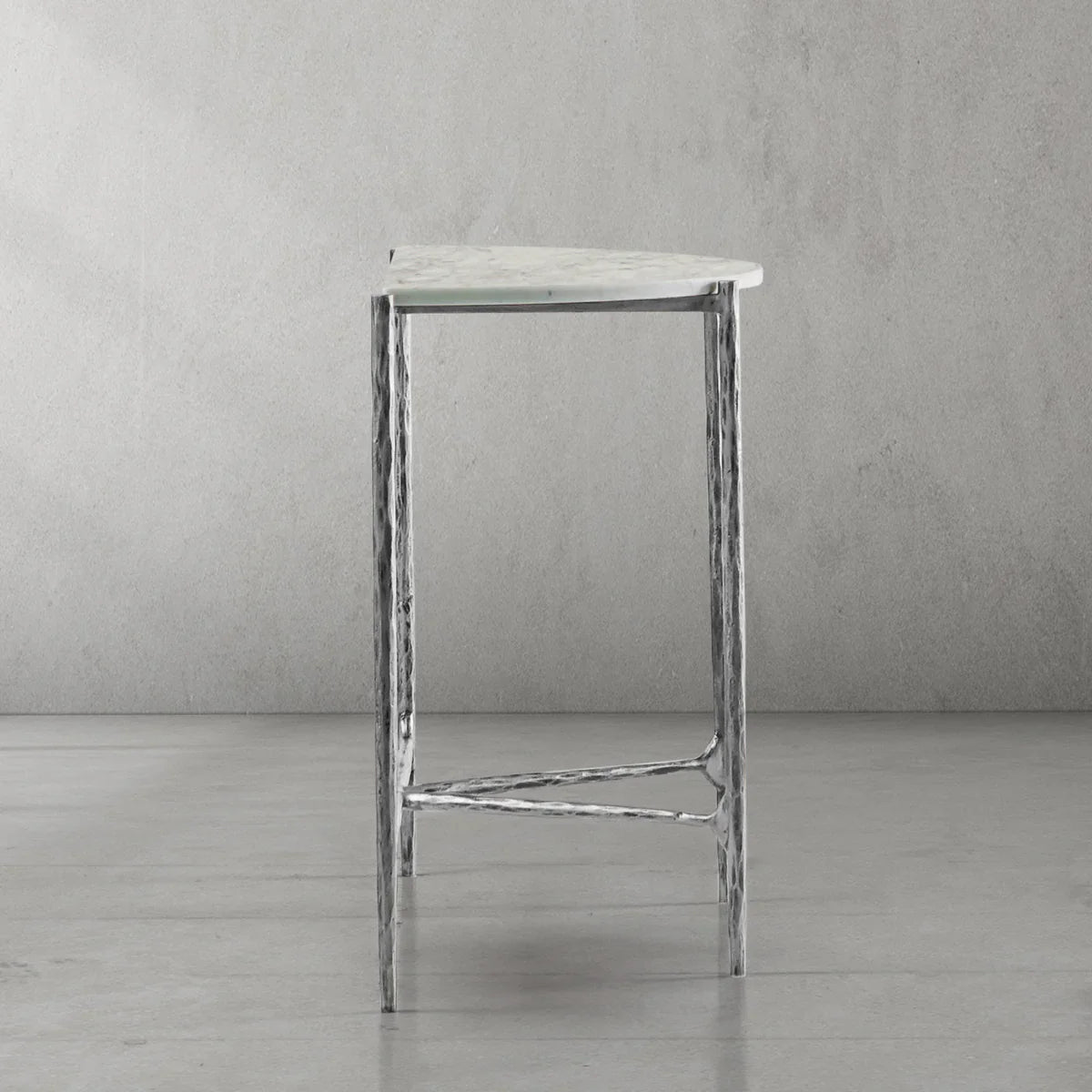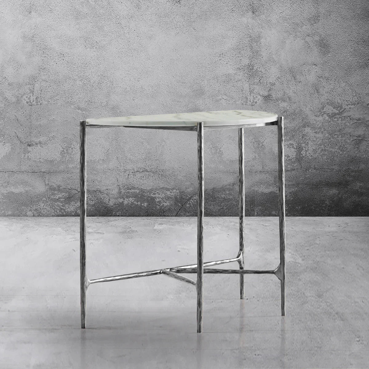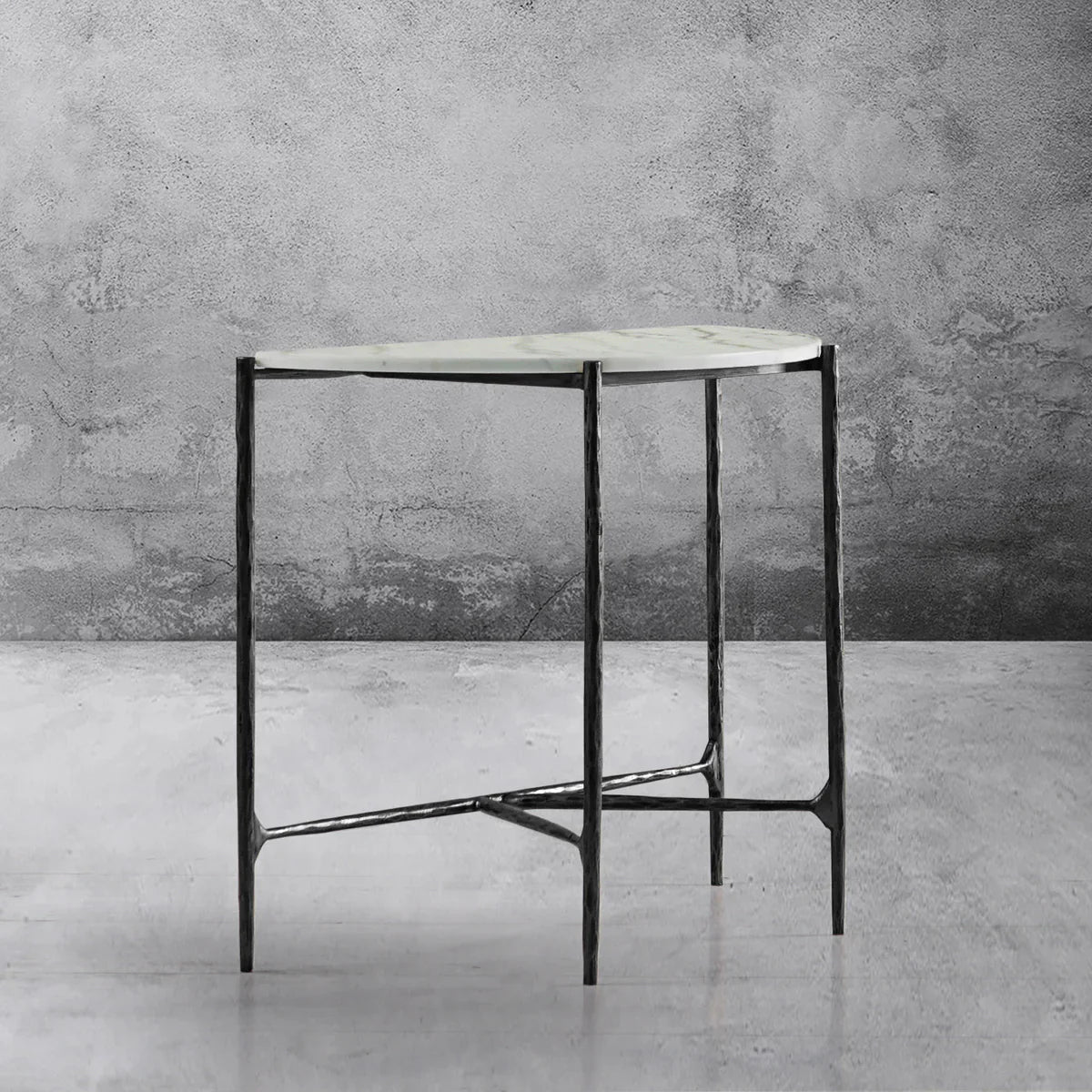 Our hand forged metal with marble collection. Using an age-old production process, artisans hand-hammer metal strips to reveal vibrant, imperfect, organic textures. The hammered, tapered silhouette provides a rich contrast to the smooth, honed stone.- Tabletop crafted of 1"-thick marble over a wood core
