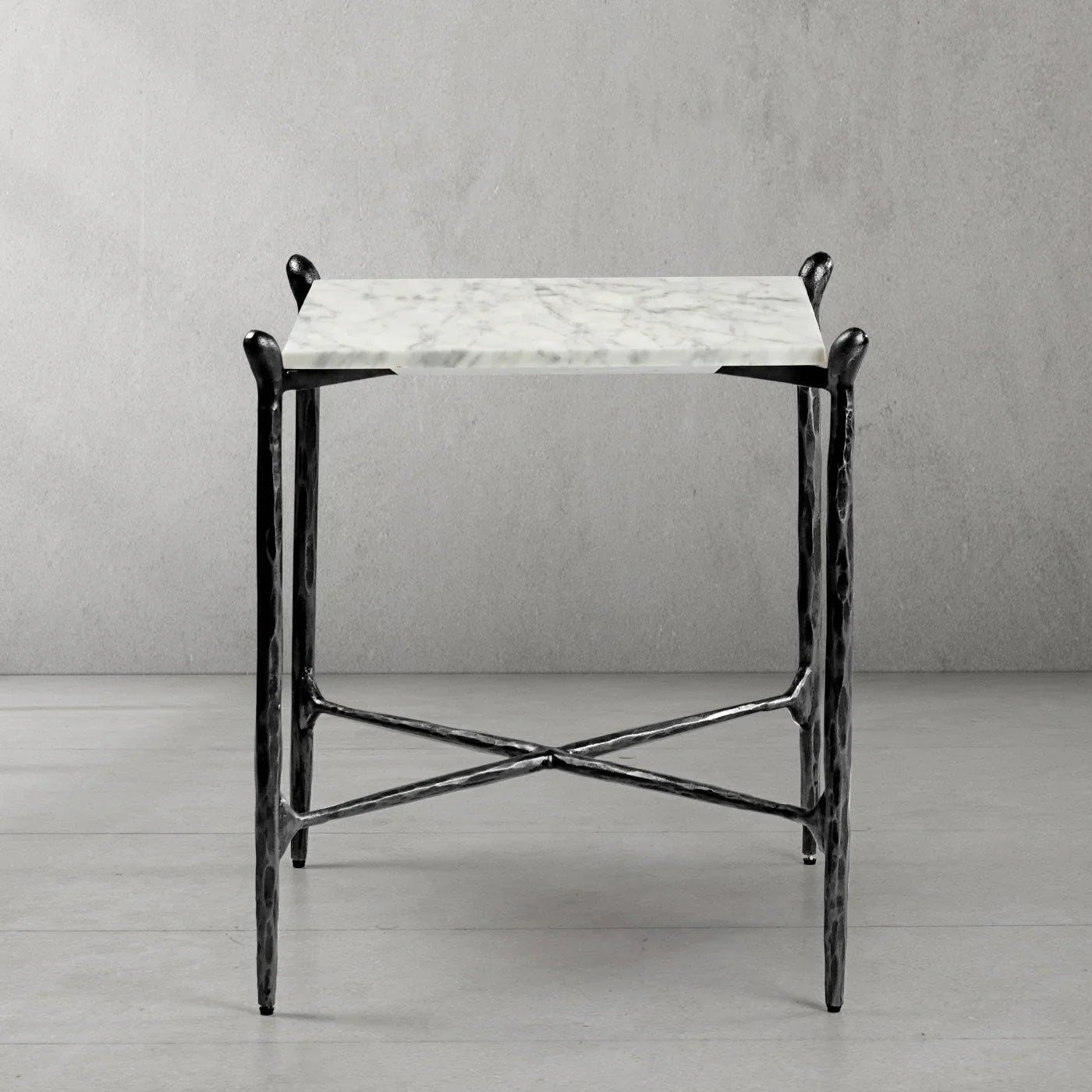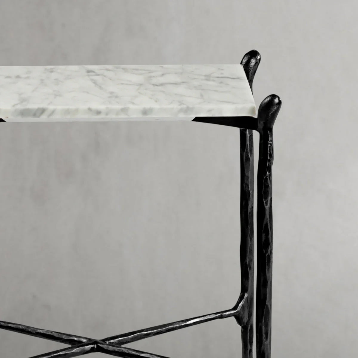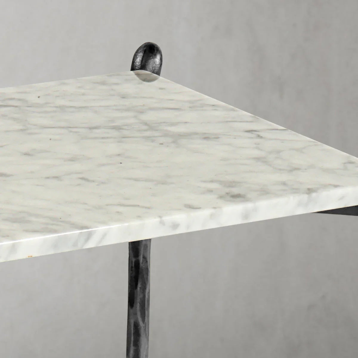 Our hand forged metal with marble collection. Using an age-old production process, artisans hand-hammer metal strips to reveal vibrant, imperfect, organic textures. The hammered, tapered silhouette provides a rich contrast to the smooth, honed stone.