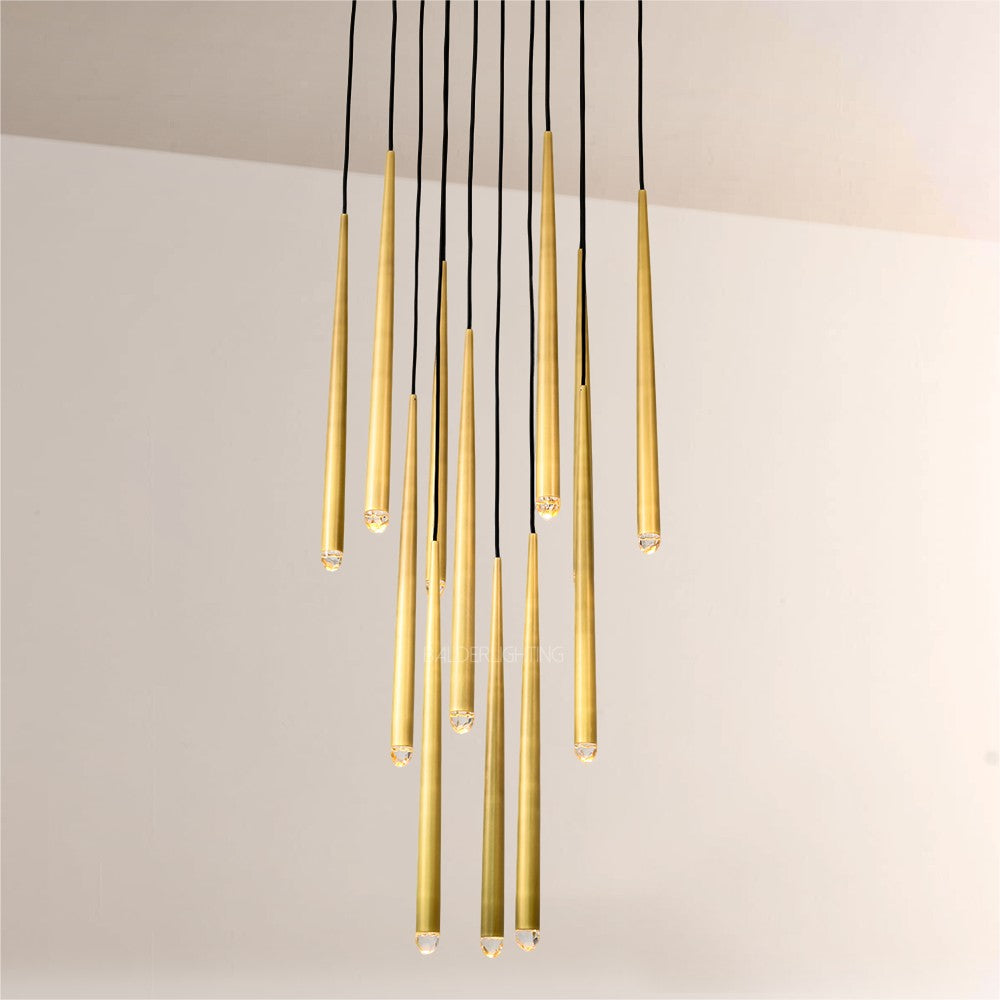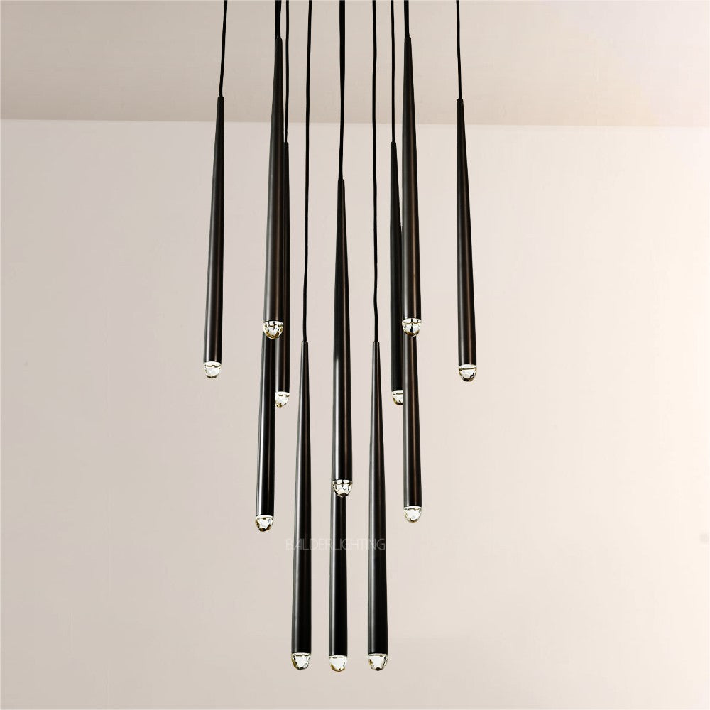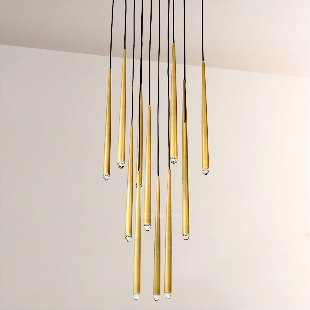The main feature of the collection is a cluster of solid brass in the form of a suspension on a thin black cord. Recessed LEDs at the top of the faceted glass provide a warm light.