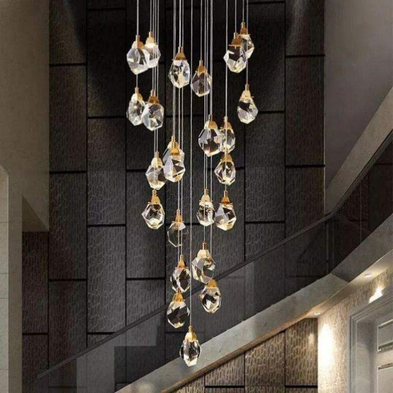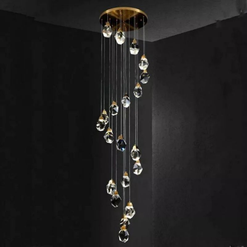 Several faceted crystals suspended from ceiling in different height,  Sparkles from every angle.Faceted crystal to refracted serval chinks of light,Every crystal is suspended from different height to send the sensuous plane,Make it install in your dinning room, living room or stairwell, showing elegant new decor.