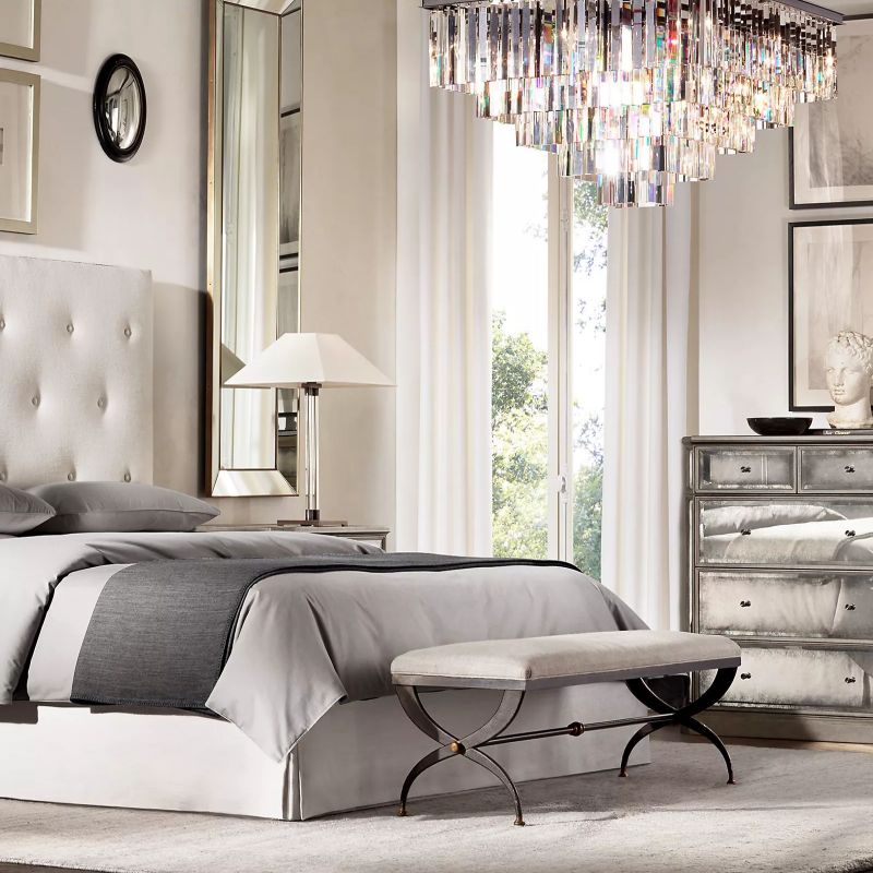 Inspired by the Art Deco style of 1920s Paris, the collection captures the period's fascination with geometric forms. Masterfully refracting the light, hundreds of faceted, dynamic prisms evoke the allure of the era. Hanging like lush fringe from a welded iron frame, the angular glass juxtaposes elegance and industrialism.