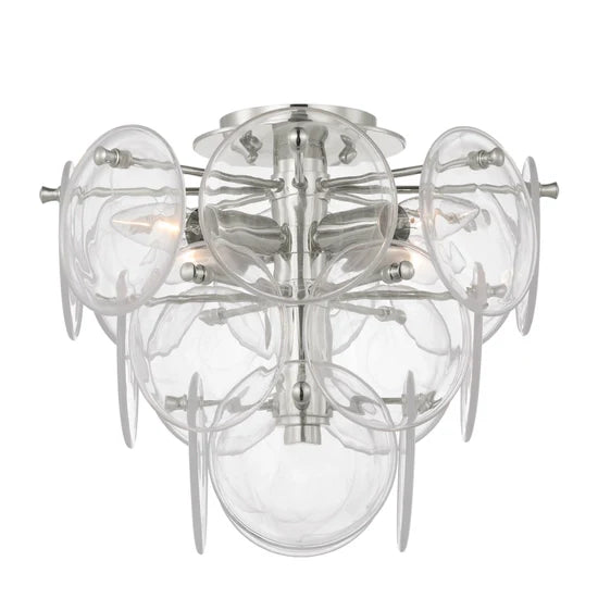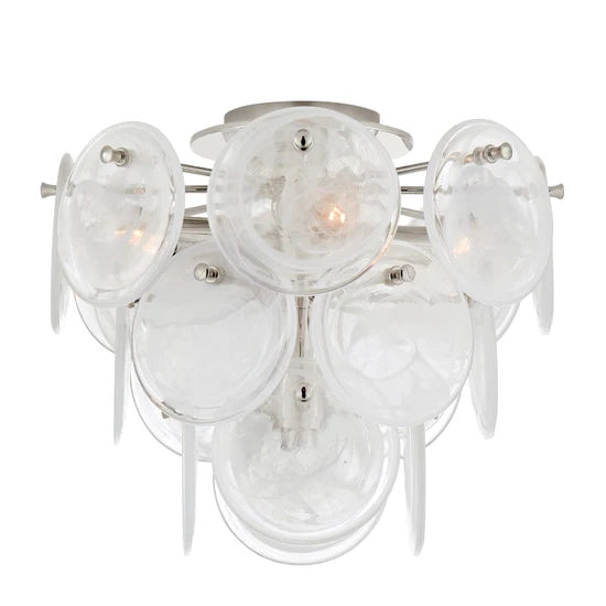 The Loire flush mount brings a touch of creativity and interest to a room. It combines circular plates of white Strie glass at three different levels, which emit a soft and beautiful glow over a room. This artistic piece works well with contemporary décor.