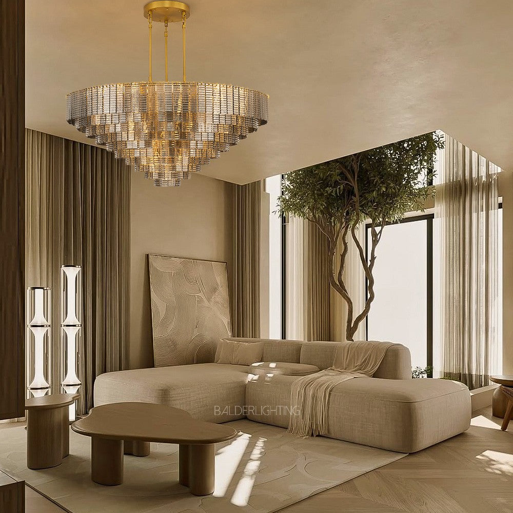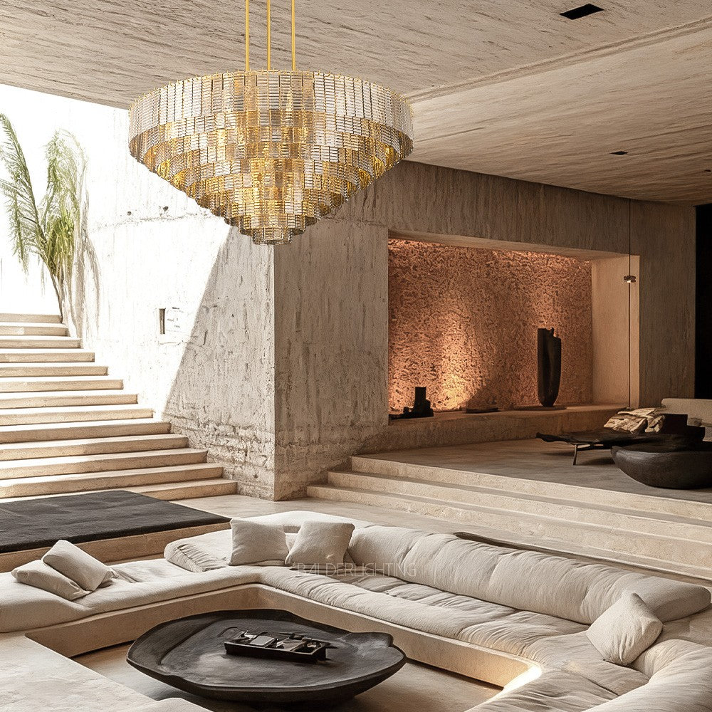 The collection's chandeliers combine traditional glassmaking techniques with modernist style. It is a study in geometric repetition, with textured ribbons of cast glass cascading in concentric circles, casting a warm glow to stunning effect. |