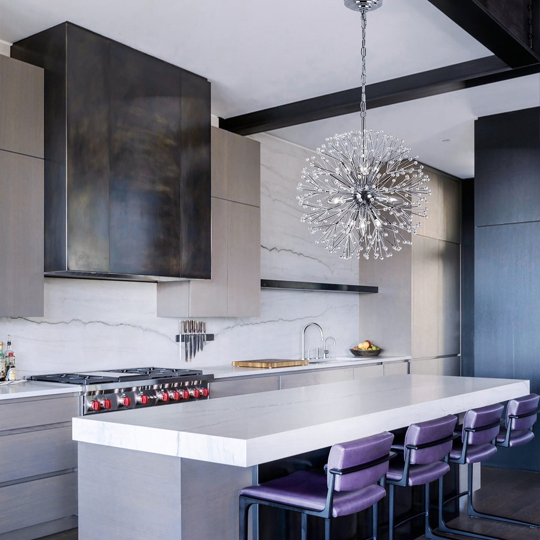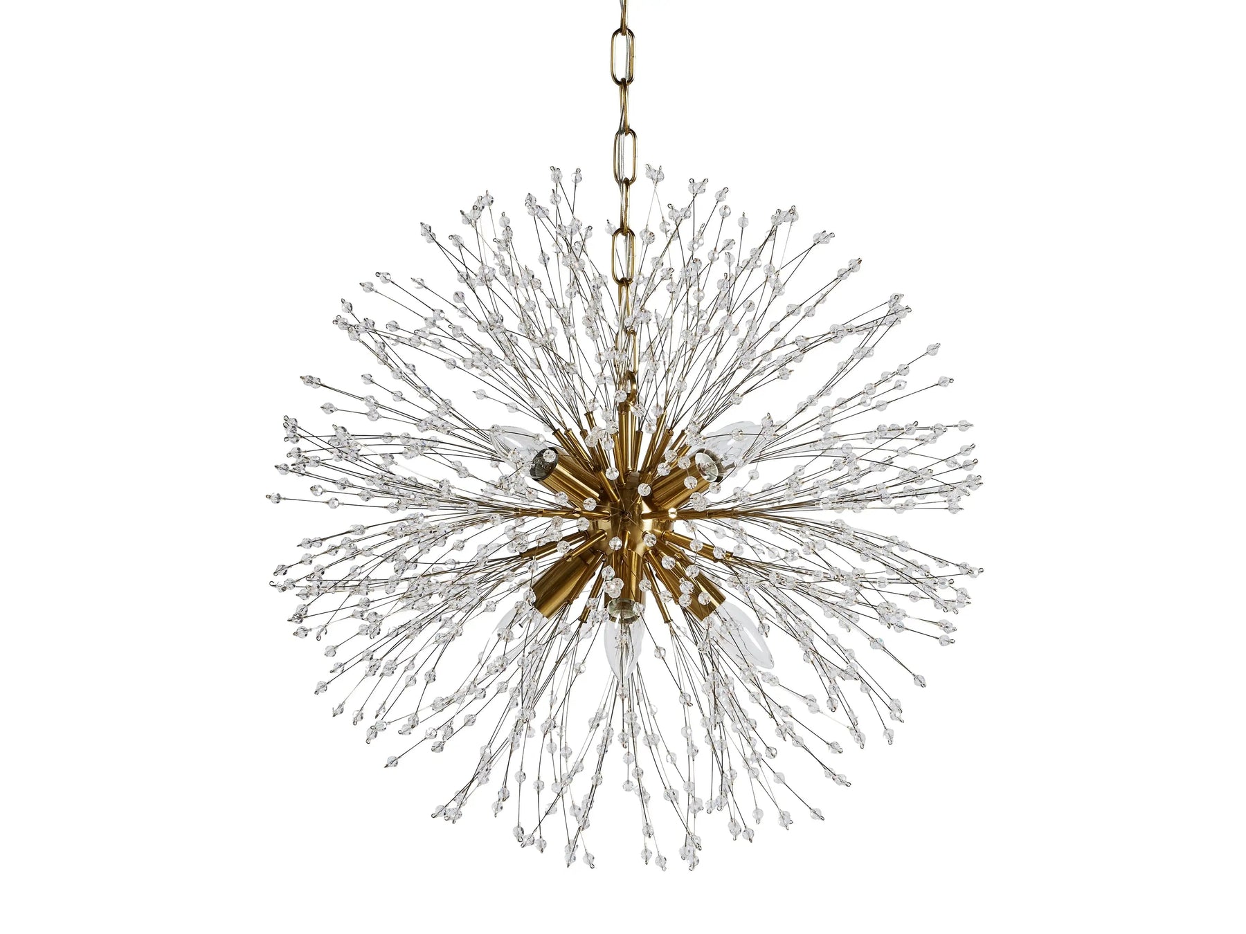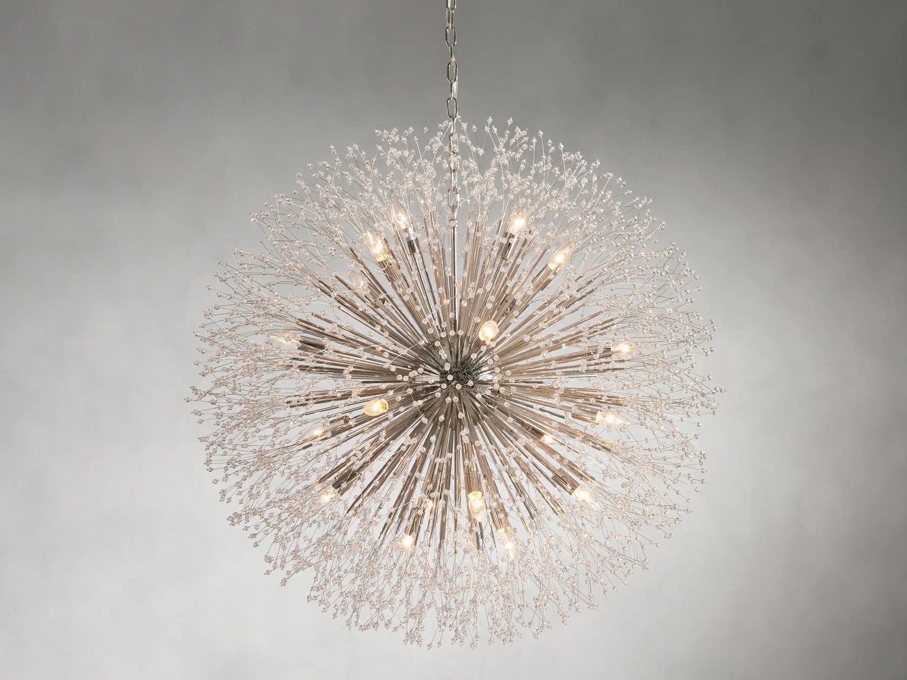 Delightfully designed to resemble a dennis after it’s blossomed, our elegant Dennis Chandelier beautifully twinkles with reflected light. Crafted from nickel-plated iron with a painted finish, Dennis’ radiating crystals will add whimsical wonder to any space.