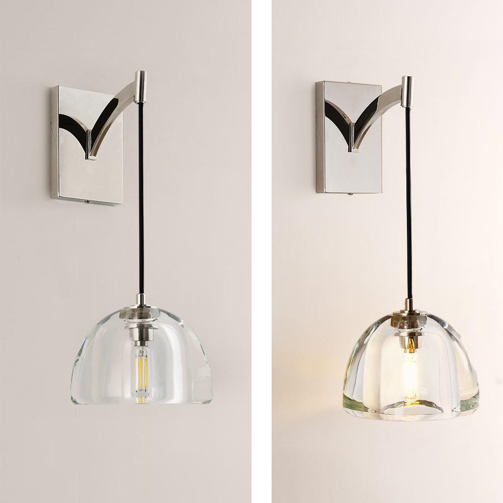 Evoking the 12th-century structure's flying buttresses, the fixture's winged armature holds aloft hemispheres of cross-cut glass. Lathe-carved from solid blocks of crystal and then hand polished, the thick, heavy domes play counterpoint to the solid brass frame's delicate arc – a vision at once fixed and fluid, strong and fragile. Viewed as an object in space, the silhouette creates a canopy of light overhead.