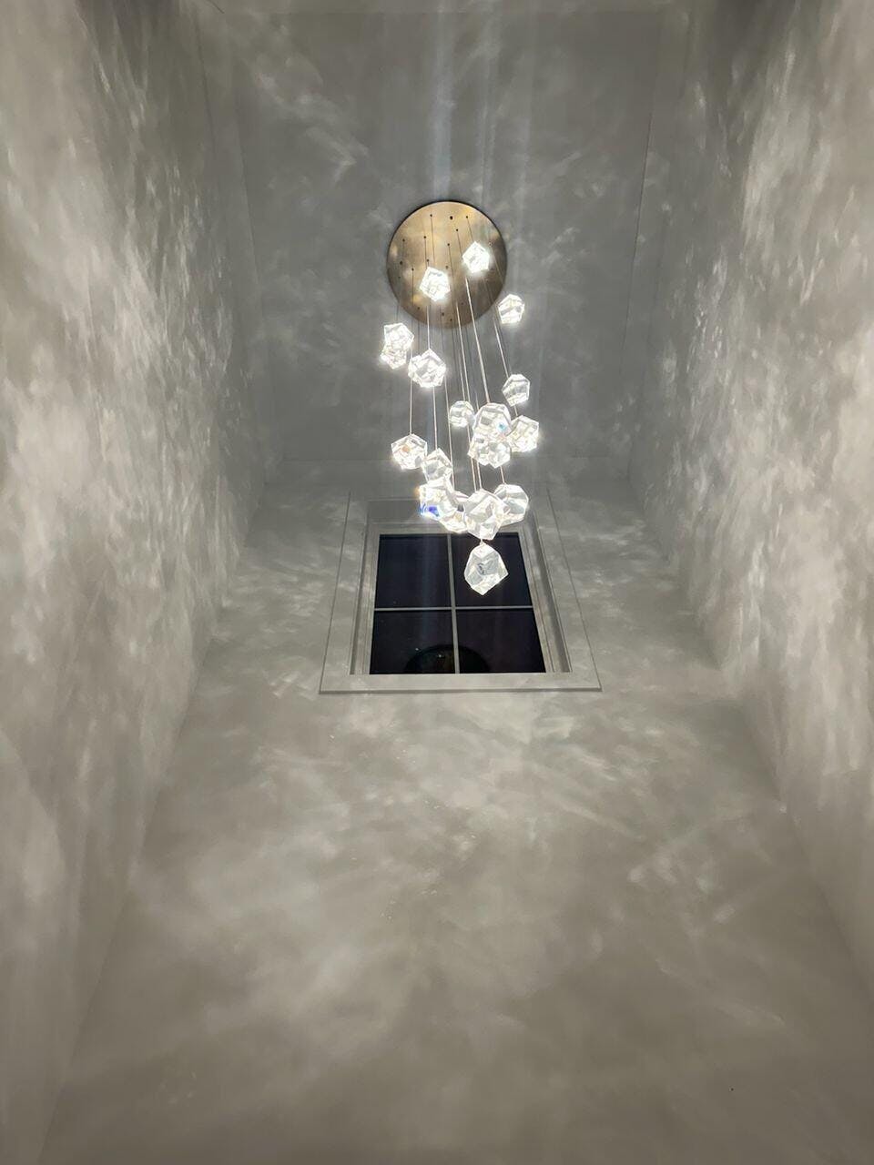 Several faceted crystals suspended from ceiling in different height, Sparkles from every angle.Faceted crystal to refracted serval chinks of light,Every crystal is suspended from different height to send the sensuous plane,Make it install in your dinning room, living room or stairwell, showing elegant new decor.