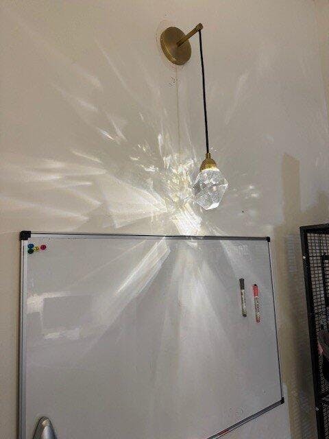 The Sconce is machined from solid brass. All parts are hand polished and patina’d. The crystal shade is hand carved and polished.