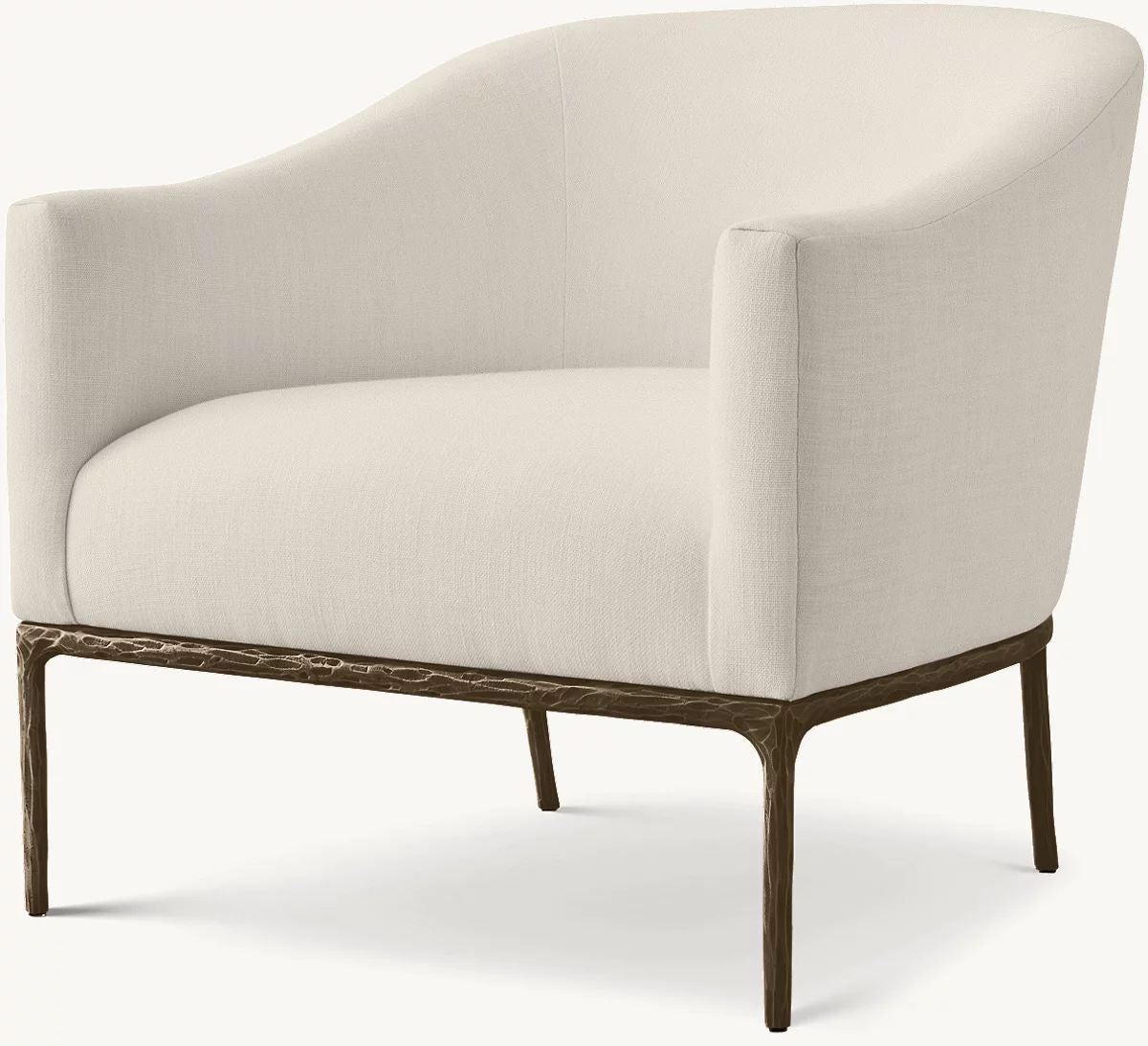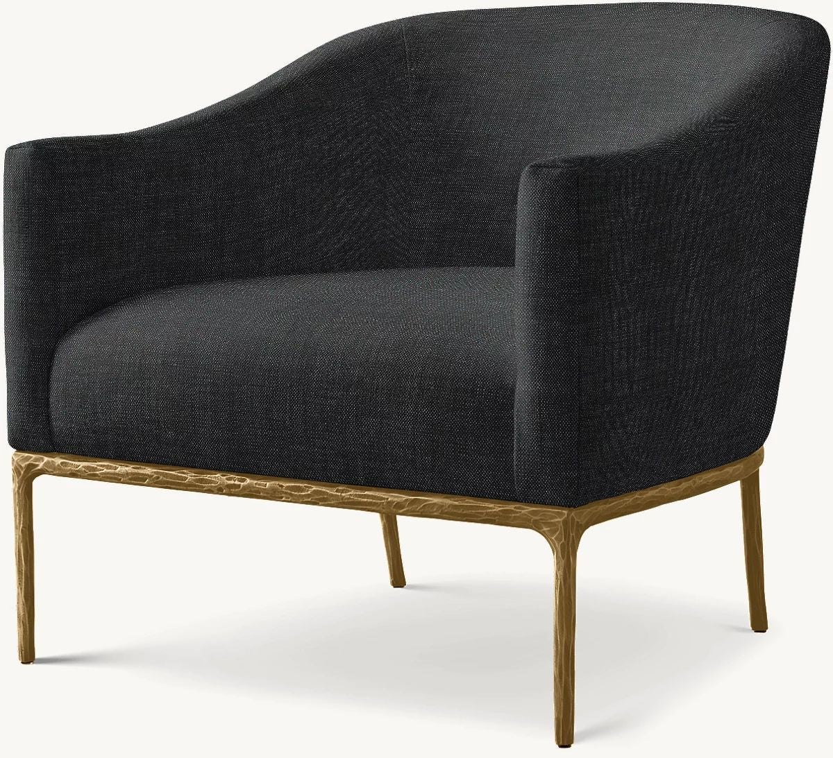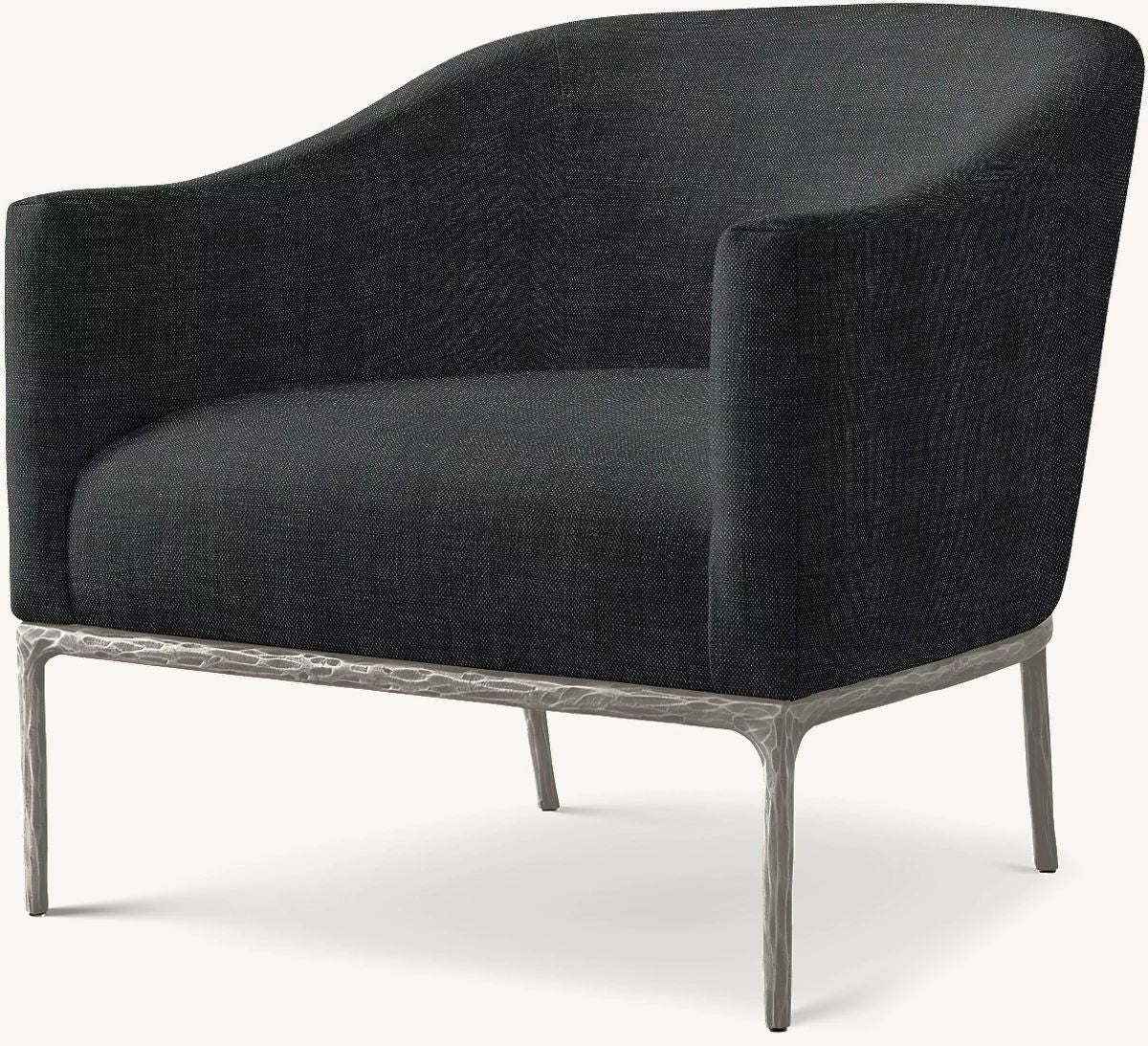 The rustic sensibility of a hand-forged metal base with tailored upholstery. Employing an ancient fabrication process, artisans hand hammer the metal bars to reveal an alive, imperfect and organic texture, a counterpoint to the frame's slender, tapered silhouette.