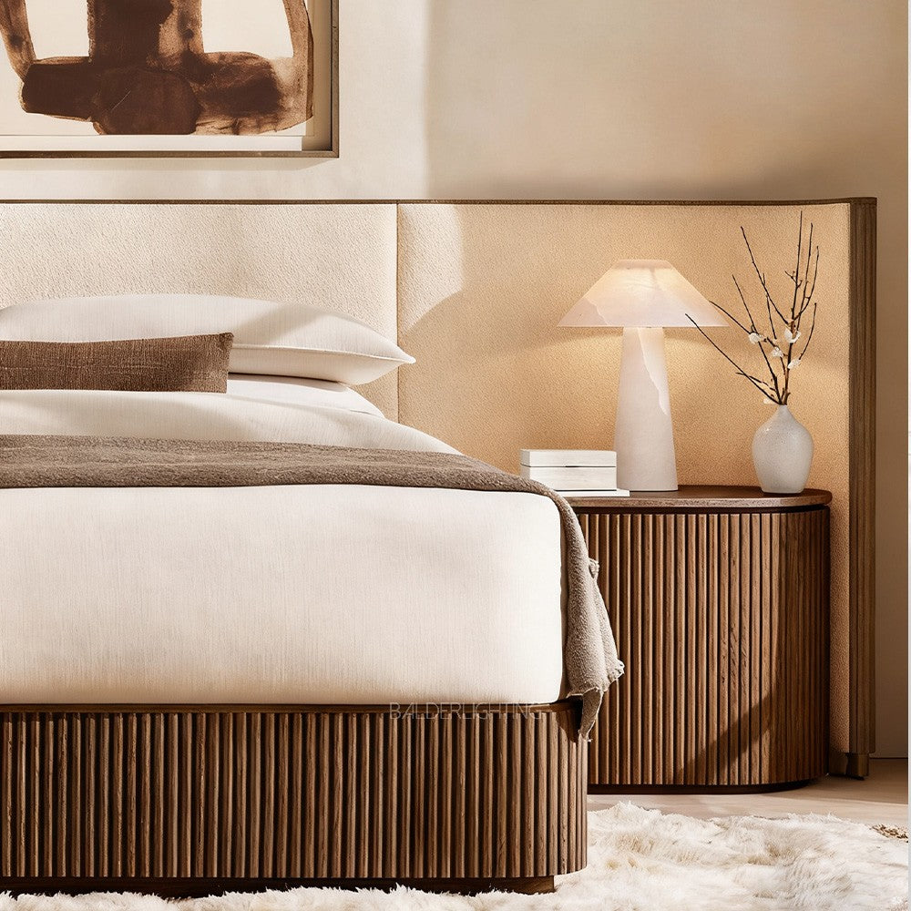 Crafted by the renowned design duo Mulholland Bina and Ronald Sasson, the Mulholland Open Nightstand exemplifies elegance and innovative design. Defined by its unique wire-brushed solid American oak reeds, this table stands out with its sophisticated texture and organic appeal. The design is softened by radius corners that curve around the sides, creating a fluid, uninterrupted silhouette that commands attention.